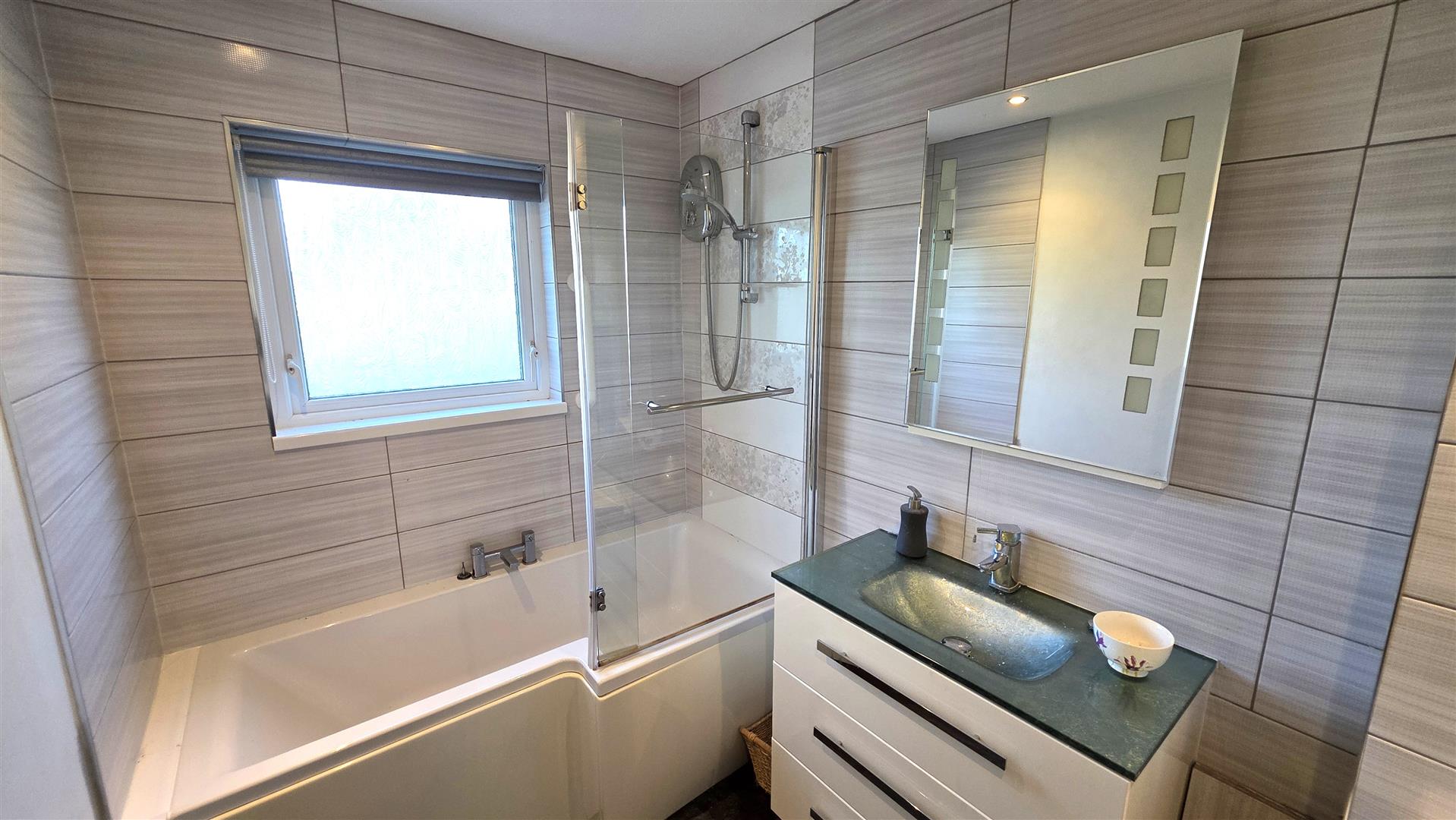 Bathroom with modern white suite complete with shower bath, "Mira" electric shower over, push button low flush W/C and feature glass wash hand basin in vanity