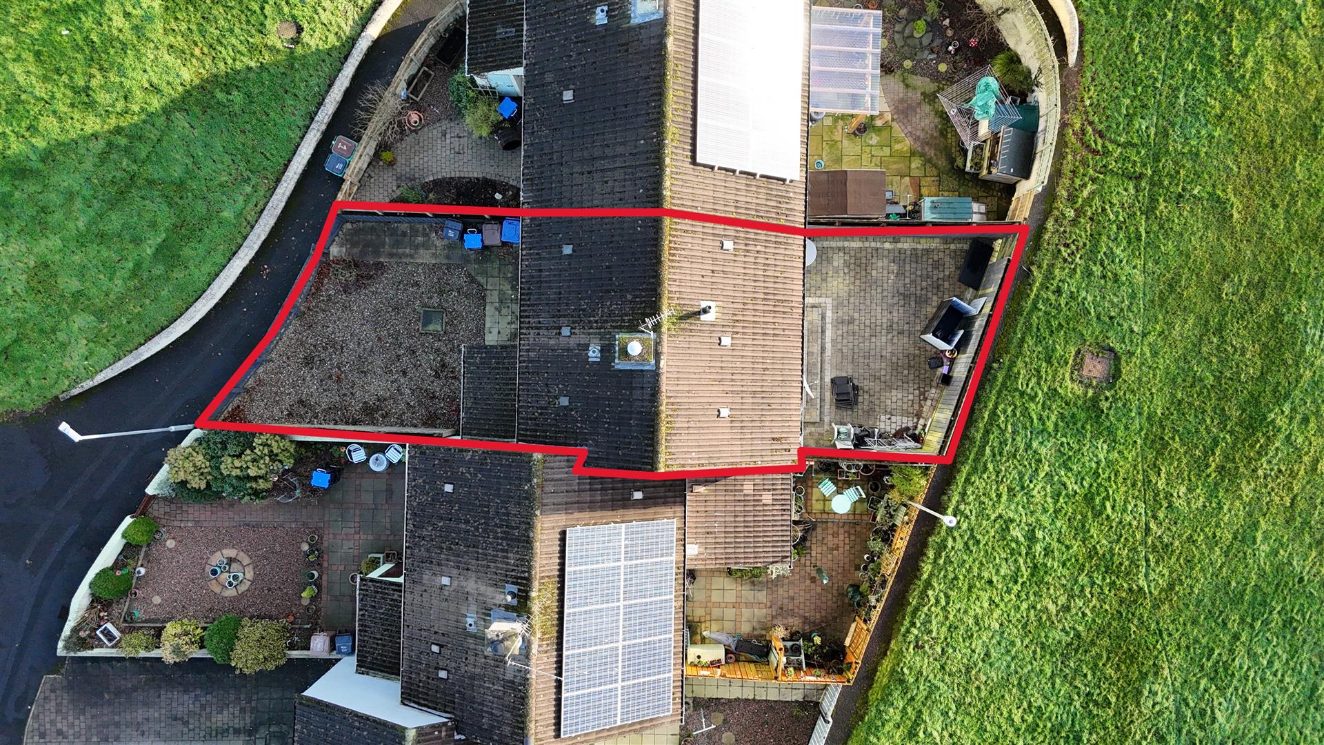 Low maintenance gardens to front in pink stone / Fully enclosed and paved garden to rear with open aspect over green area