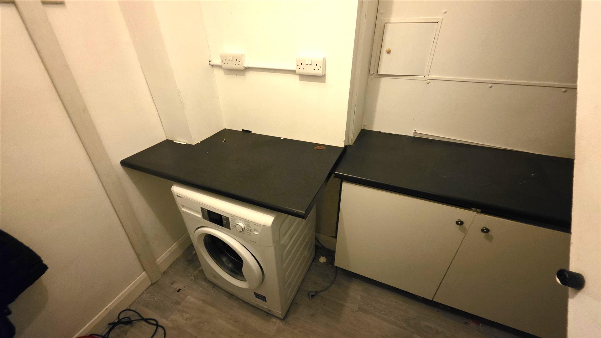 (max) Low level units and contrasting work surfaces. Plumbed for washing machine. Cloaks hanging space. Open to understairs.