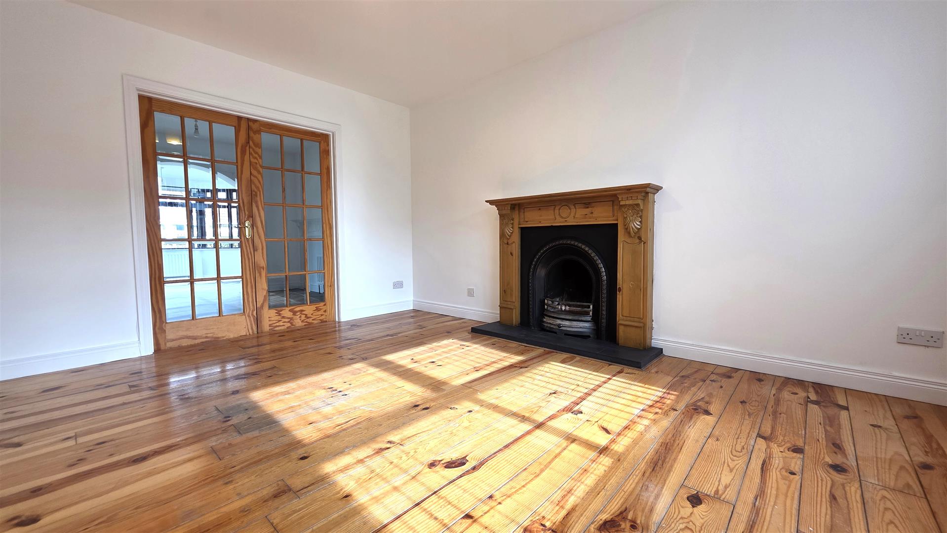 Open fire with ornate wooden surround. Part polished cast iron inset and slate tiled hearth. Solid wood floor. Double radiator. 15 pane bevelled glass French doors to: