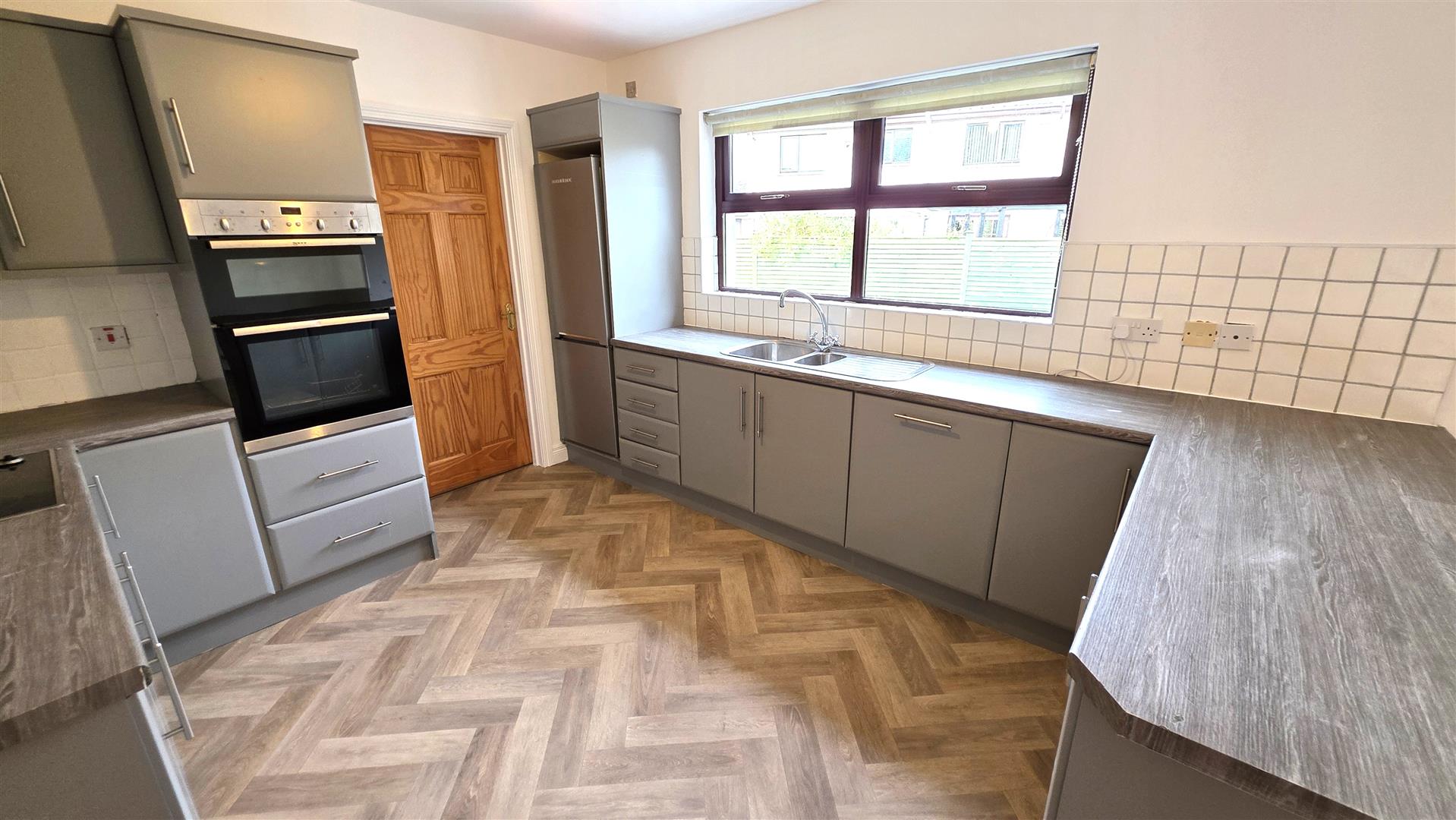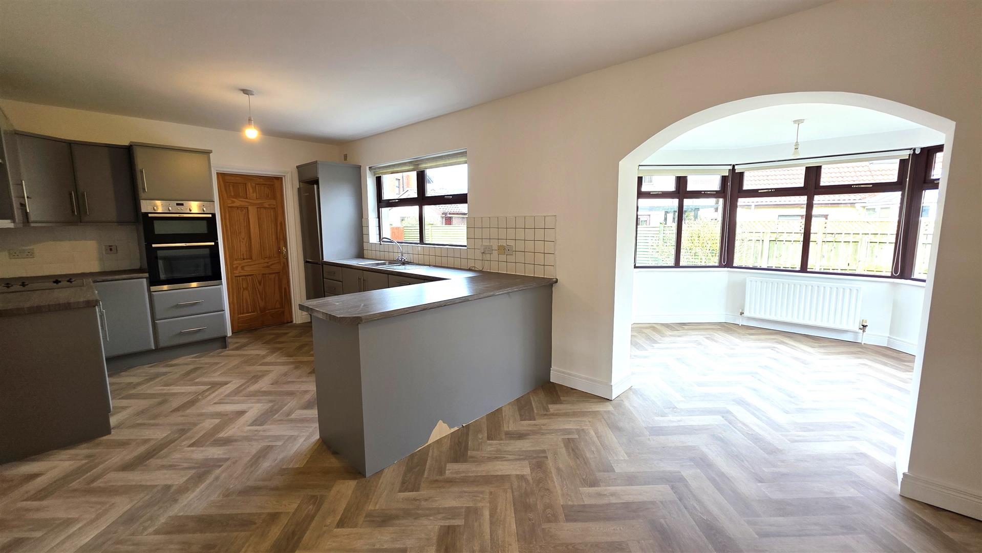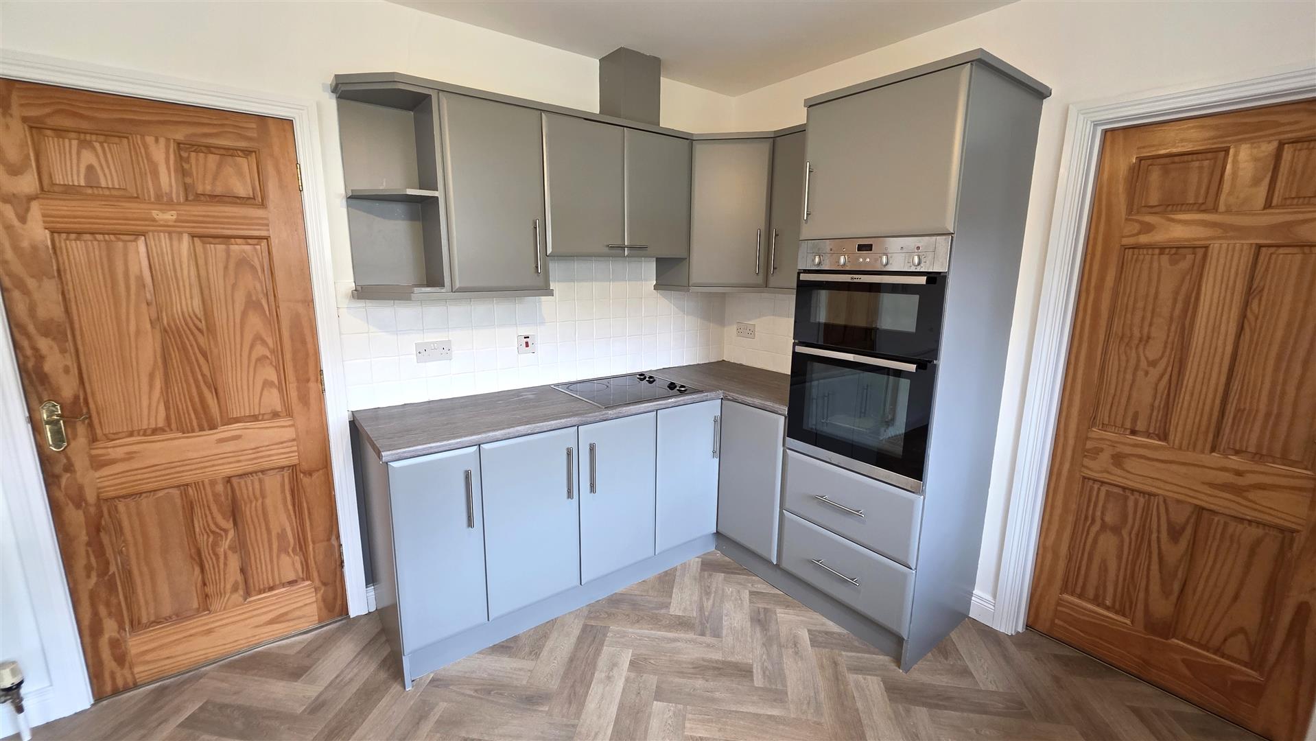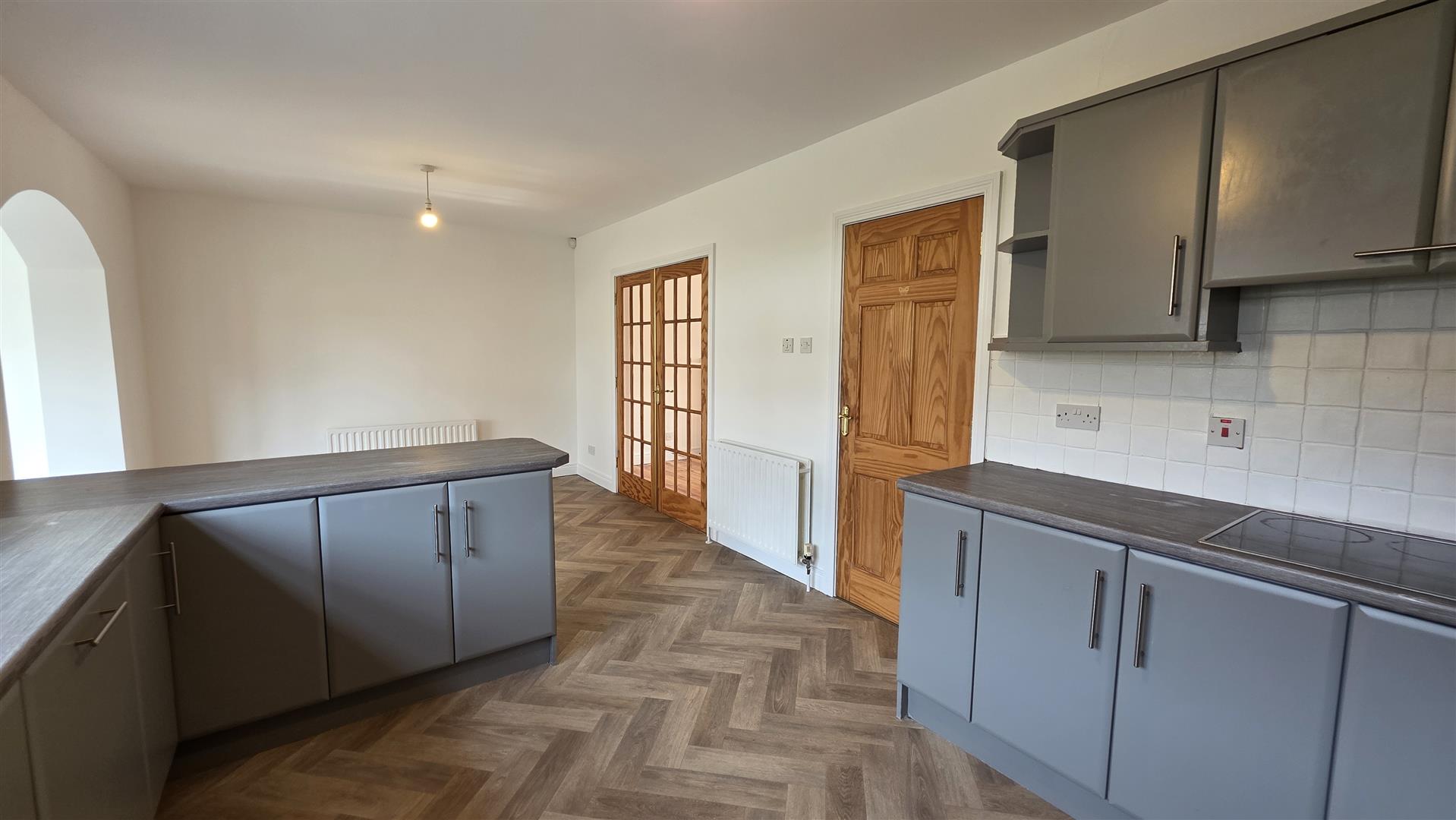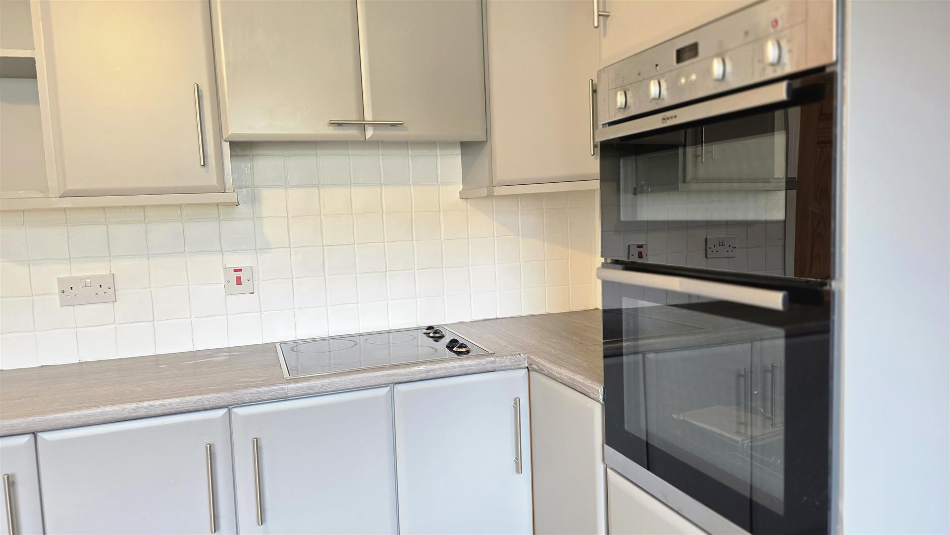 Full range of mid grey wrapped high and low level units with complimentary work surfaces. One and a quarter bowl single drainer stainless steel sink unit and mixer taps. Integrated four ring halogen hob, mid level "Neff" oven and separate grill. Integrated dish washer. Space for fridge freezer. Part tiled walls to work surfaces. Two double radiators. Open arch way to: