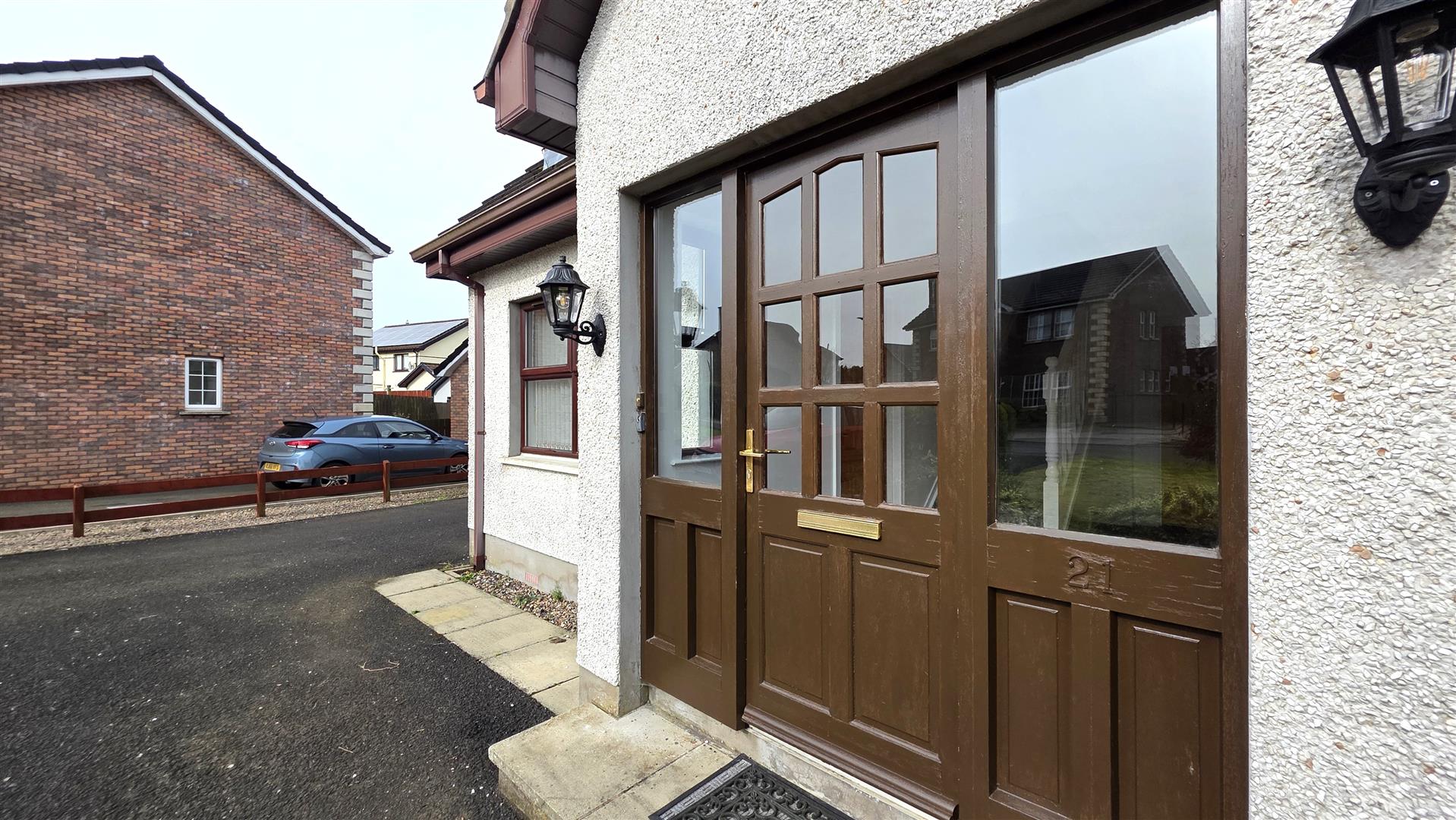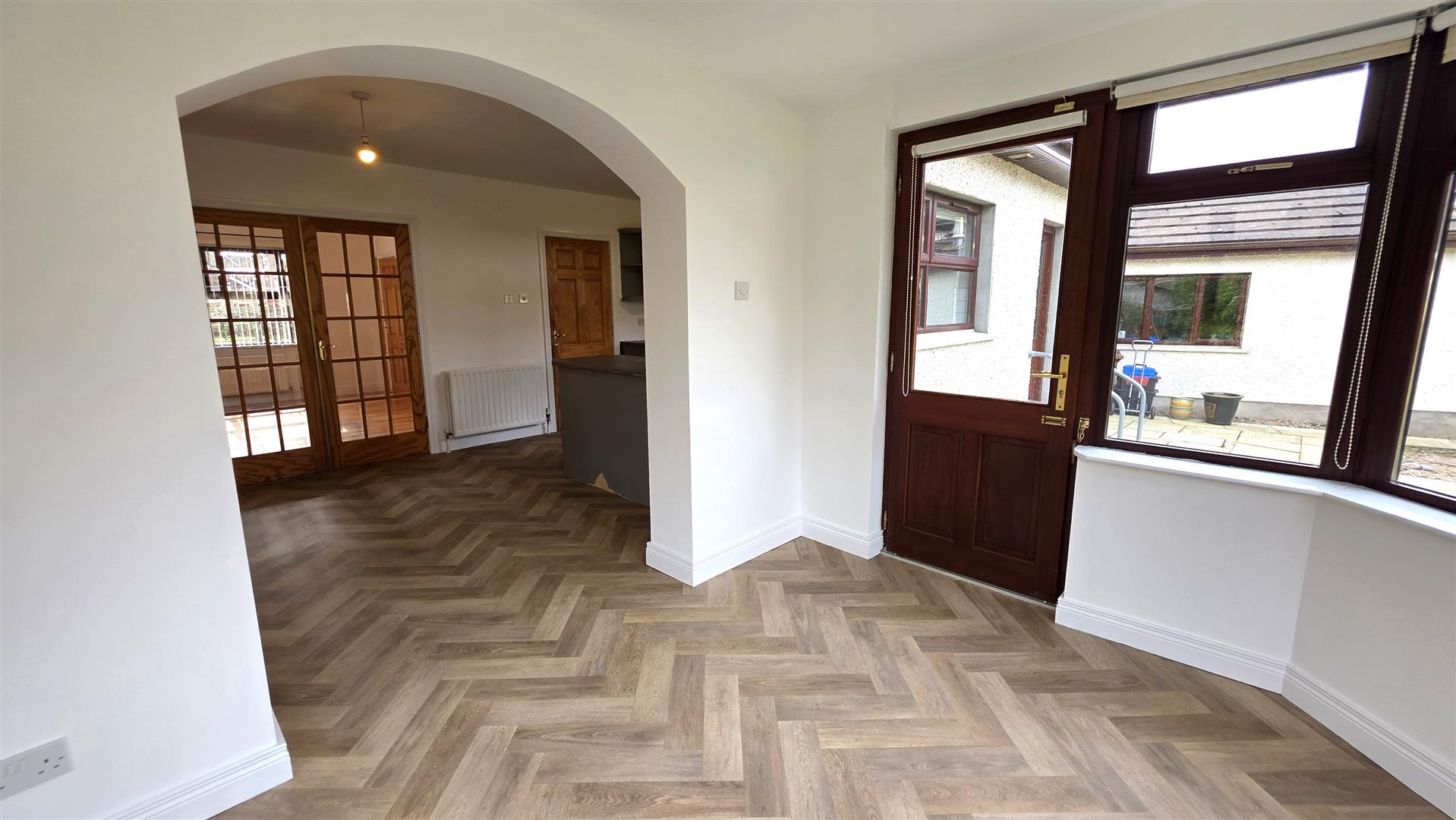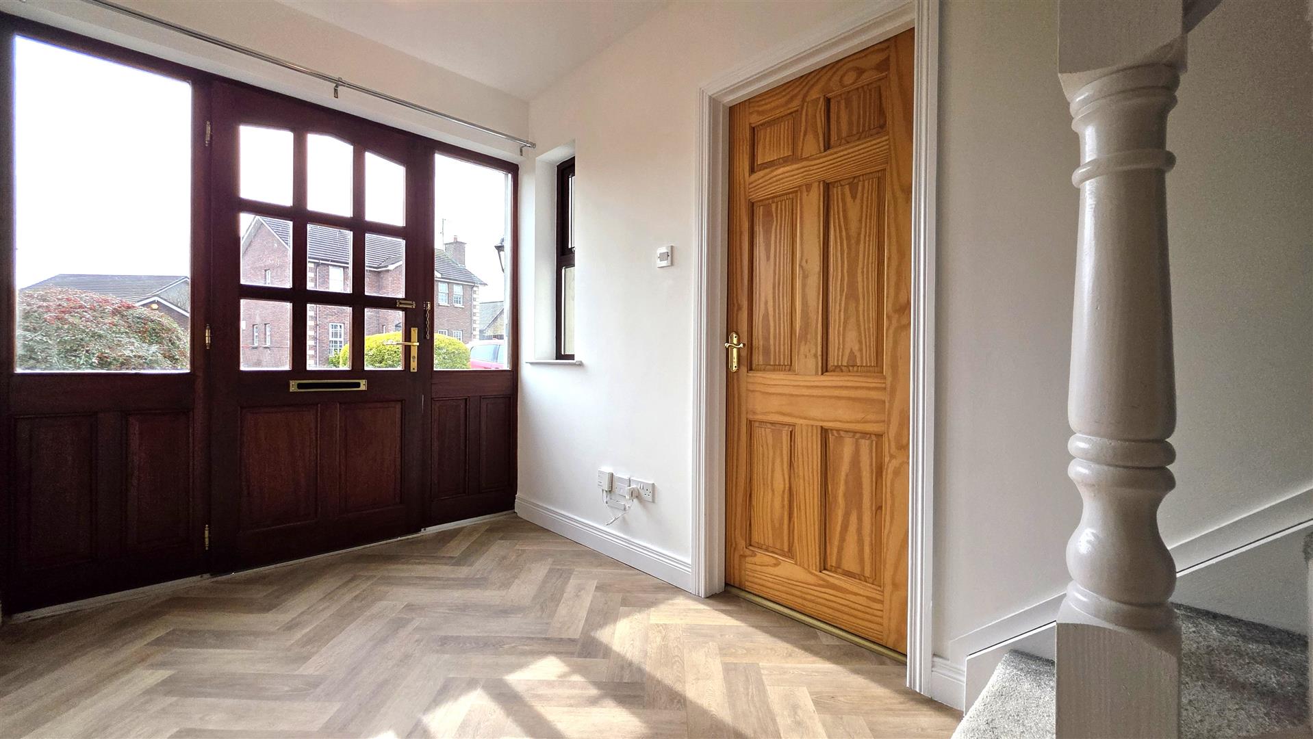 Mahogany effect PVC double glazed windows / Pine internal doors / Security alarm / PVC fascia and soffits / Seamless aluminium gutters