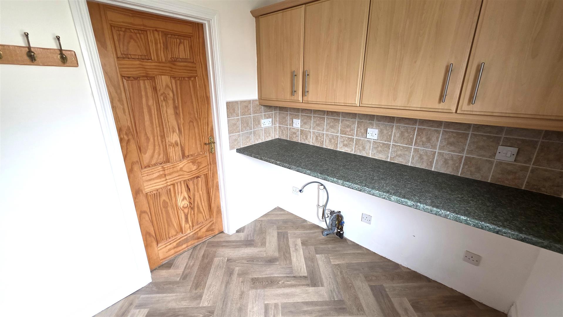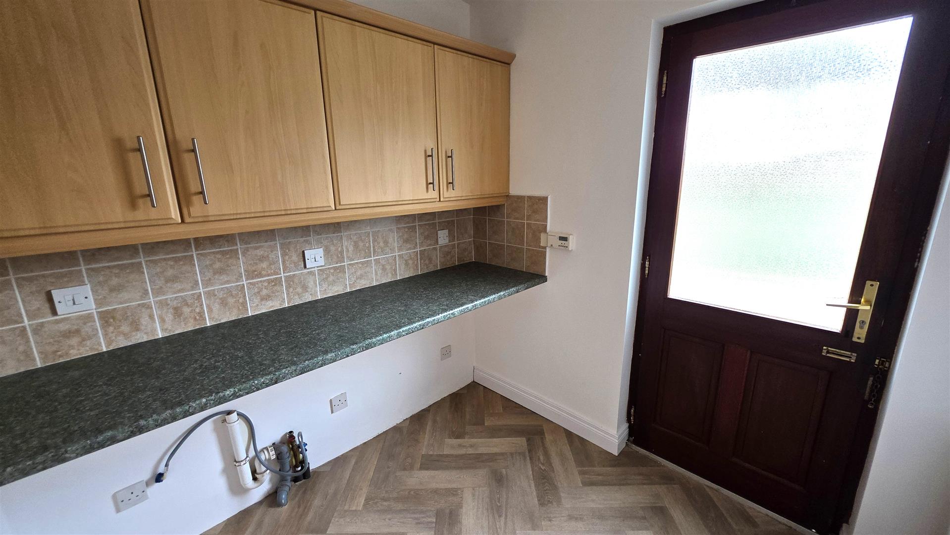 Full range of Maple effect high level units with complimentary work surfaces. Part tiled walls to work surfaces. Plumbed for washing machine and space for condenser dryer. Hardwood double glazed door to rear. Double radiator.