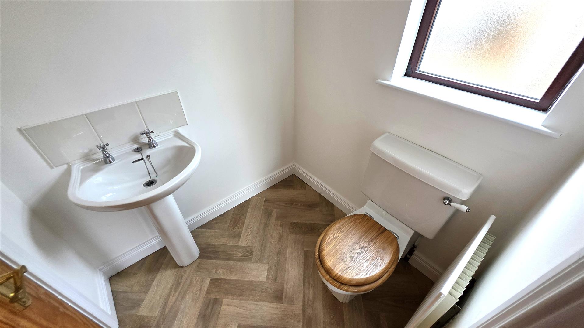 White suite comprising low flush W/C and pedestal wash hand basin. Tiled splash back. Gable side window. Single radiator. Door to storage cupboard with shelving.