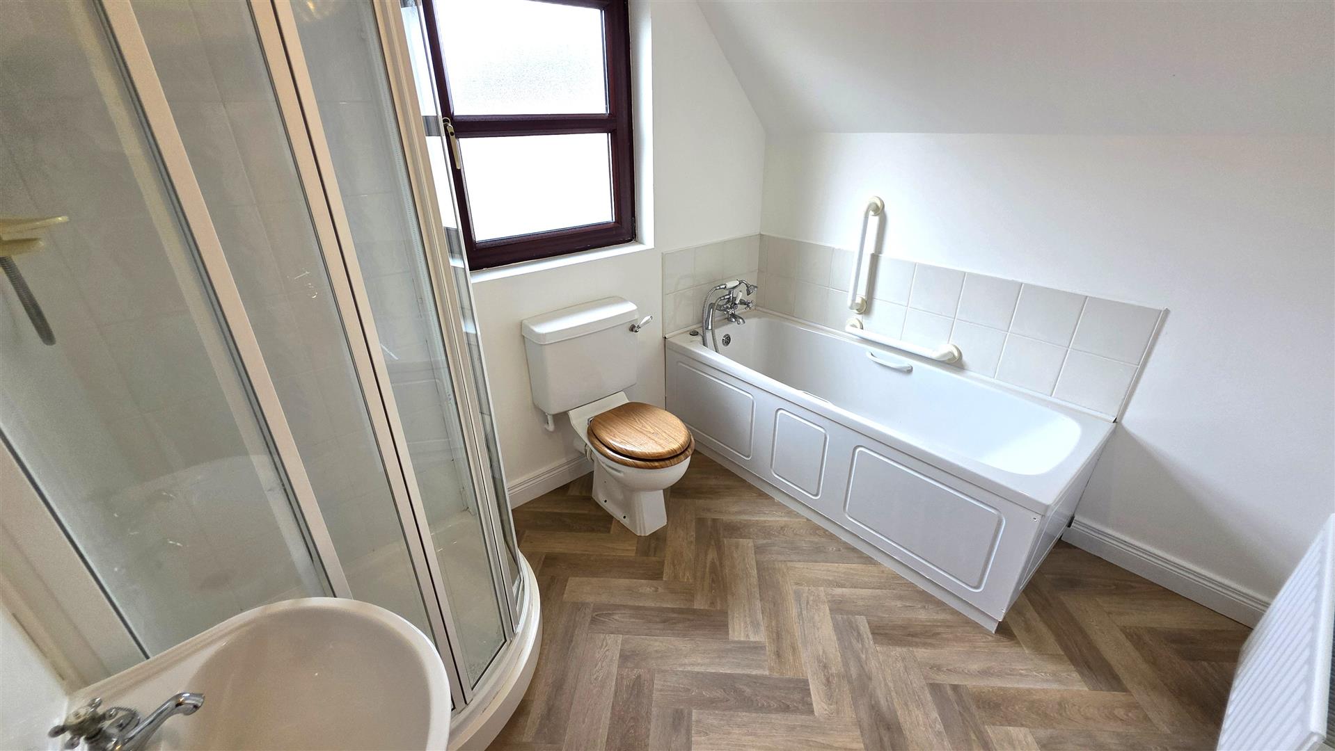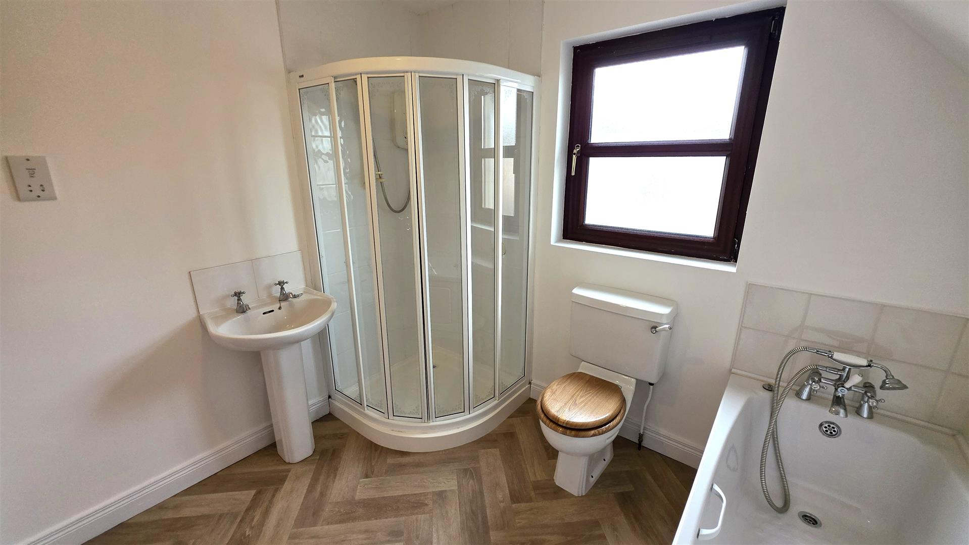 White suite comprising panelled bath with chrome antique style telephone hand shower, low flush W/C and fully tiled corner quadrant shower cubicle with "Mira Sport" electric shower and sliding cubicle doors. Pedestal wash hand basin with tiled splash back. Gable side window. Shaver point. Extractor fan. Double radiator.