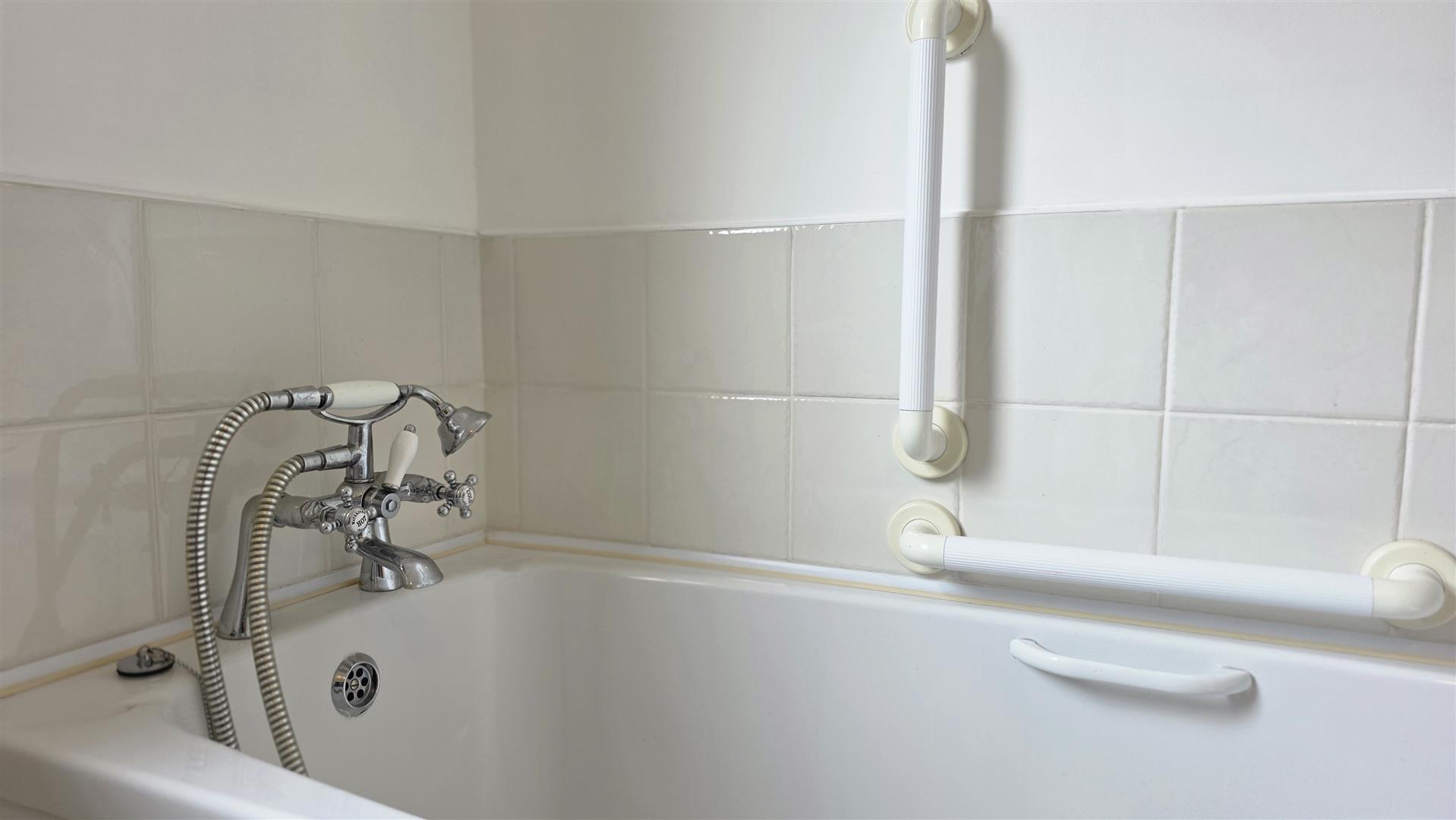 Spacious bathroom with white suite to include panel bath and separate shower unit