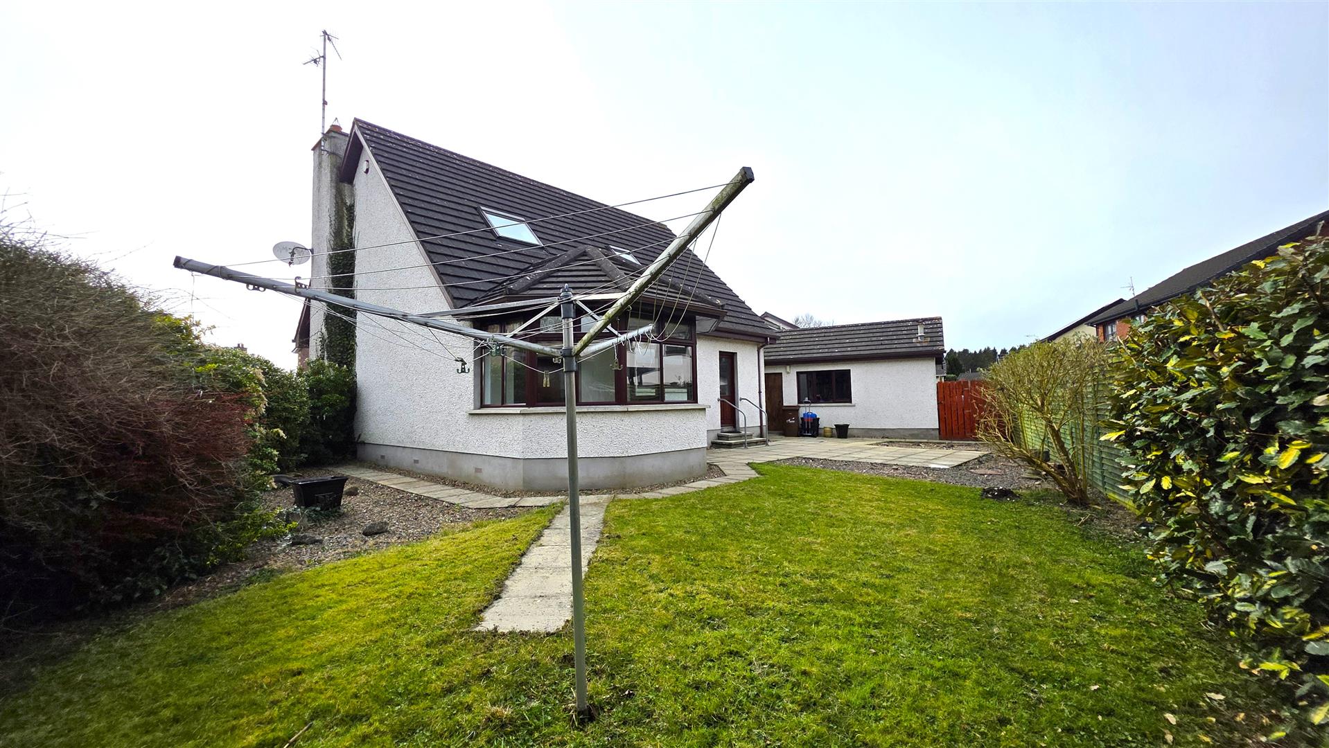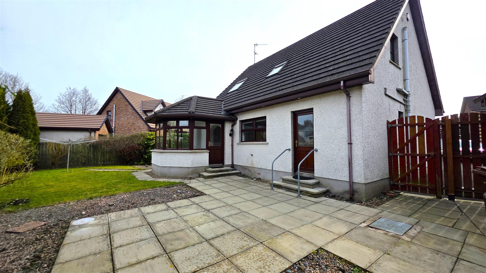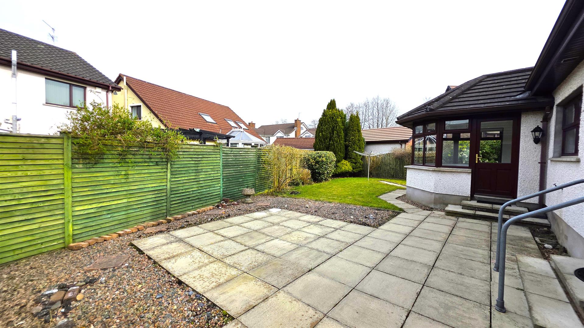 Low maintenance rear garden in neat lawn, pink stone borders, paved pathway and patio. Outside tap. Mature conifers, shrubs and bushes. Timber pedestrian gate to side. Timber pedestrian gate to rear of garage for PVC oil tank.