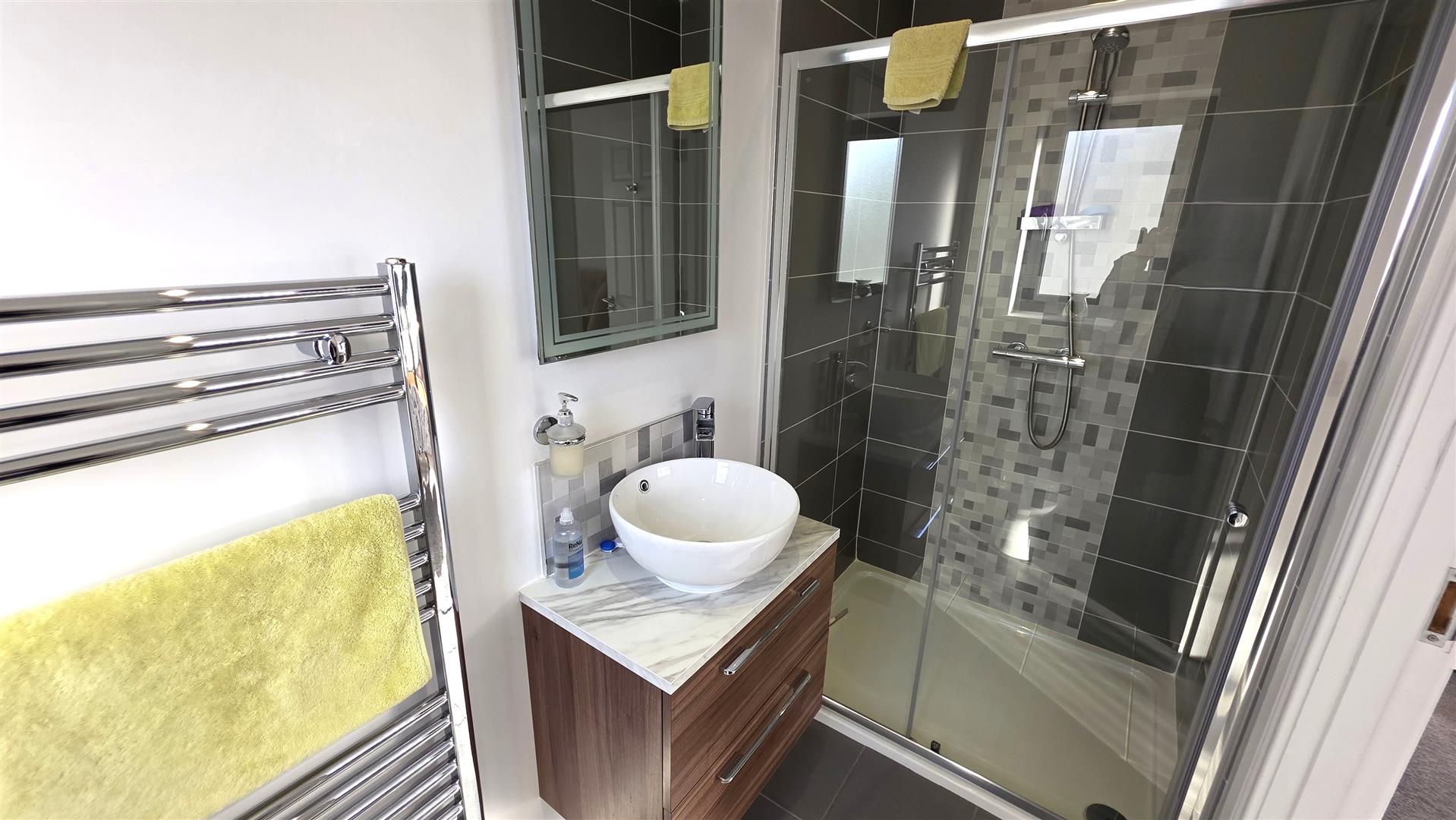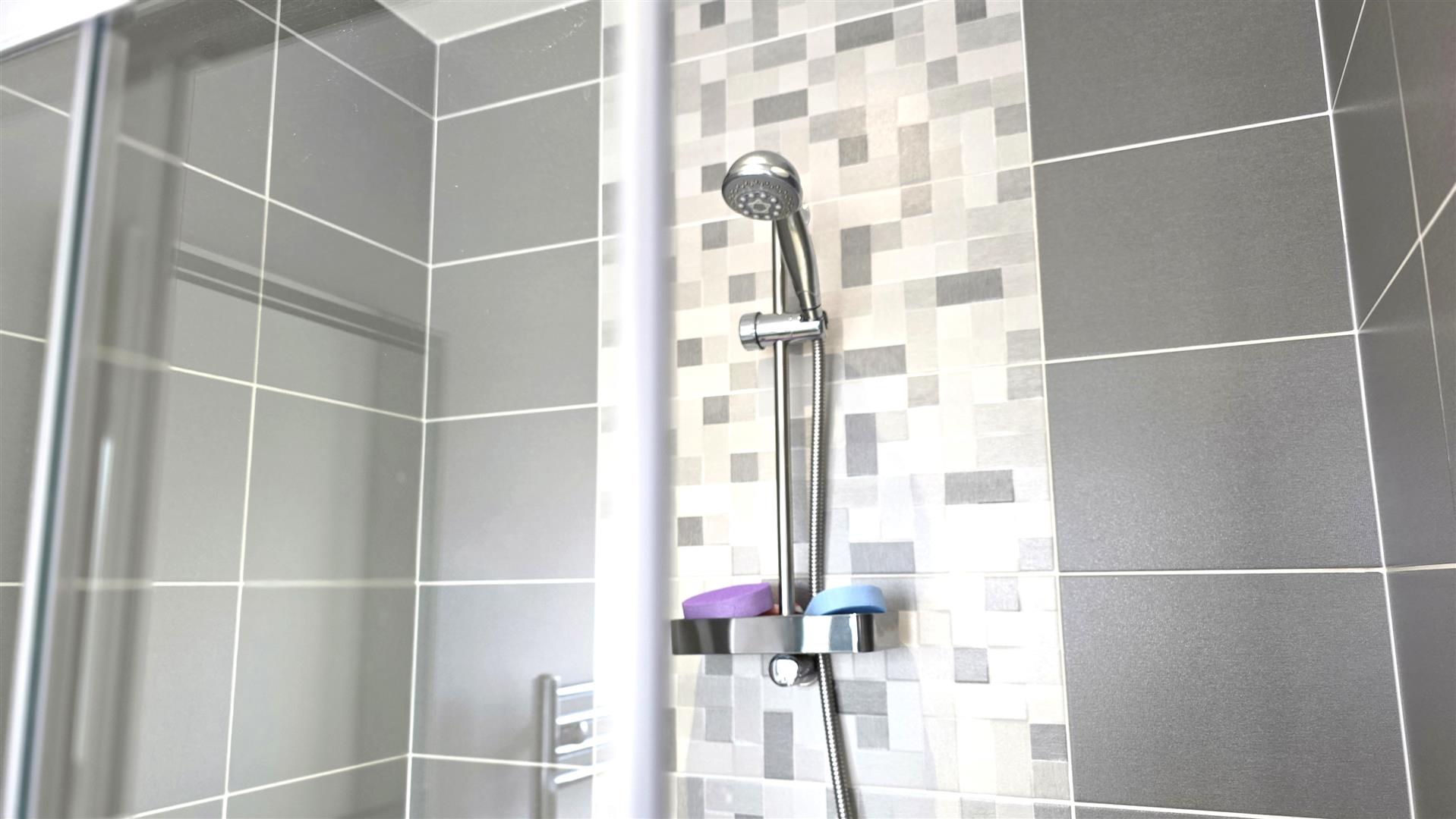 Modern white suite, comprising a large wall to wall shower with fully tiled splashback and partially glazed sliding door. Contemporary, luxury countertop style basin unit with high rise waterfall chrome mixer tap, tiled splashback and storage below. Low flush push button WC. Fully tiled flooring. Low voltage down lighting. Extractor fan. Chrome towel radiator.