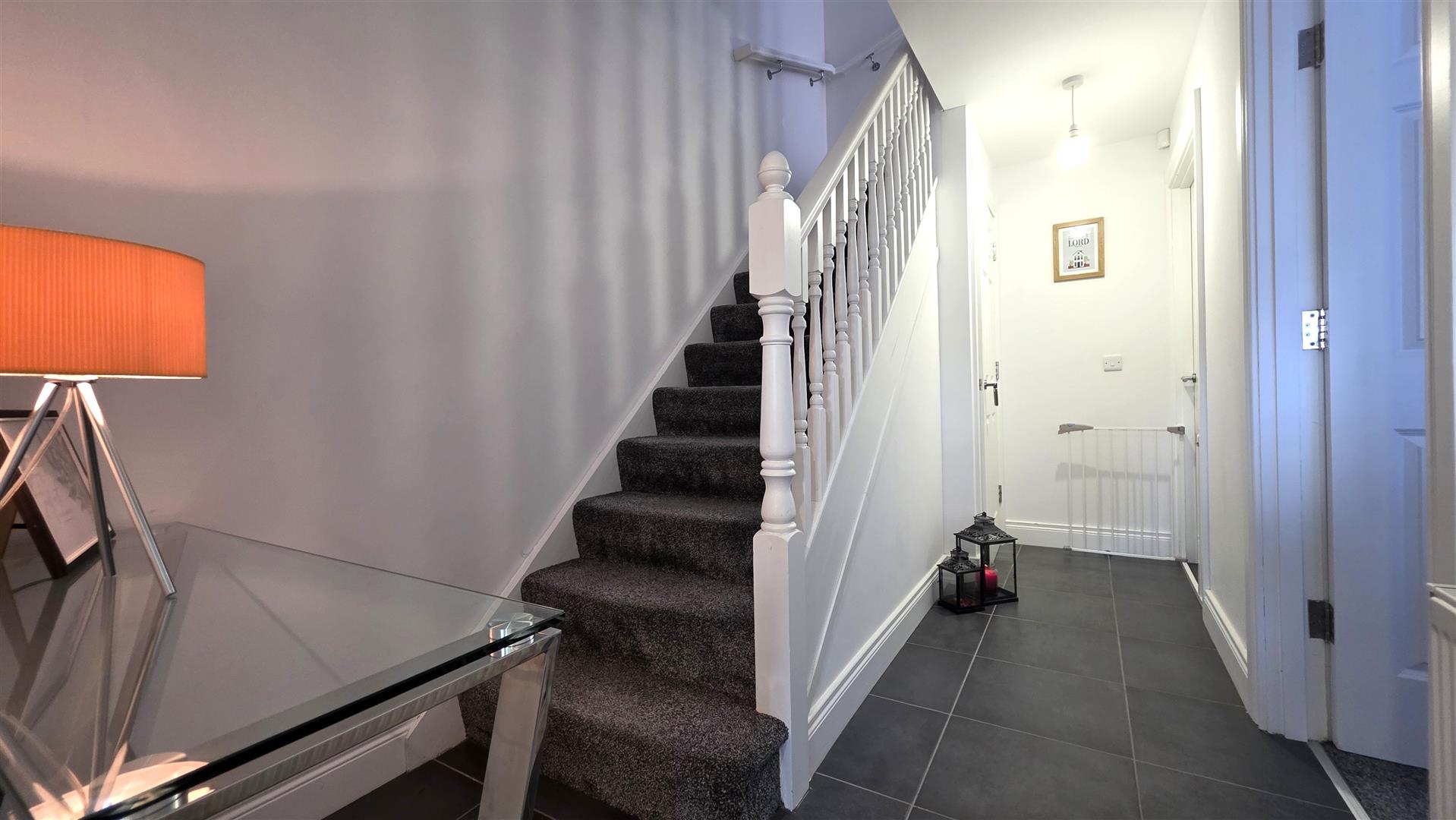 Double glazed composite door to entrance with fully tiled flooring. Alarm keypad. Stairs to first floor with moulded handrail and turned balustrading. Understairs storage cupboard. Single radiator.