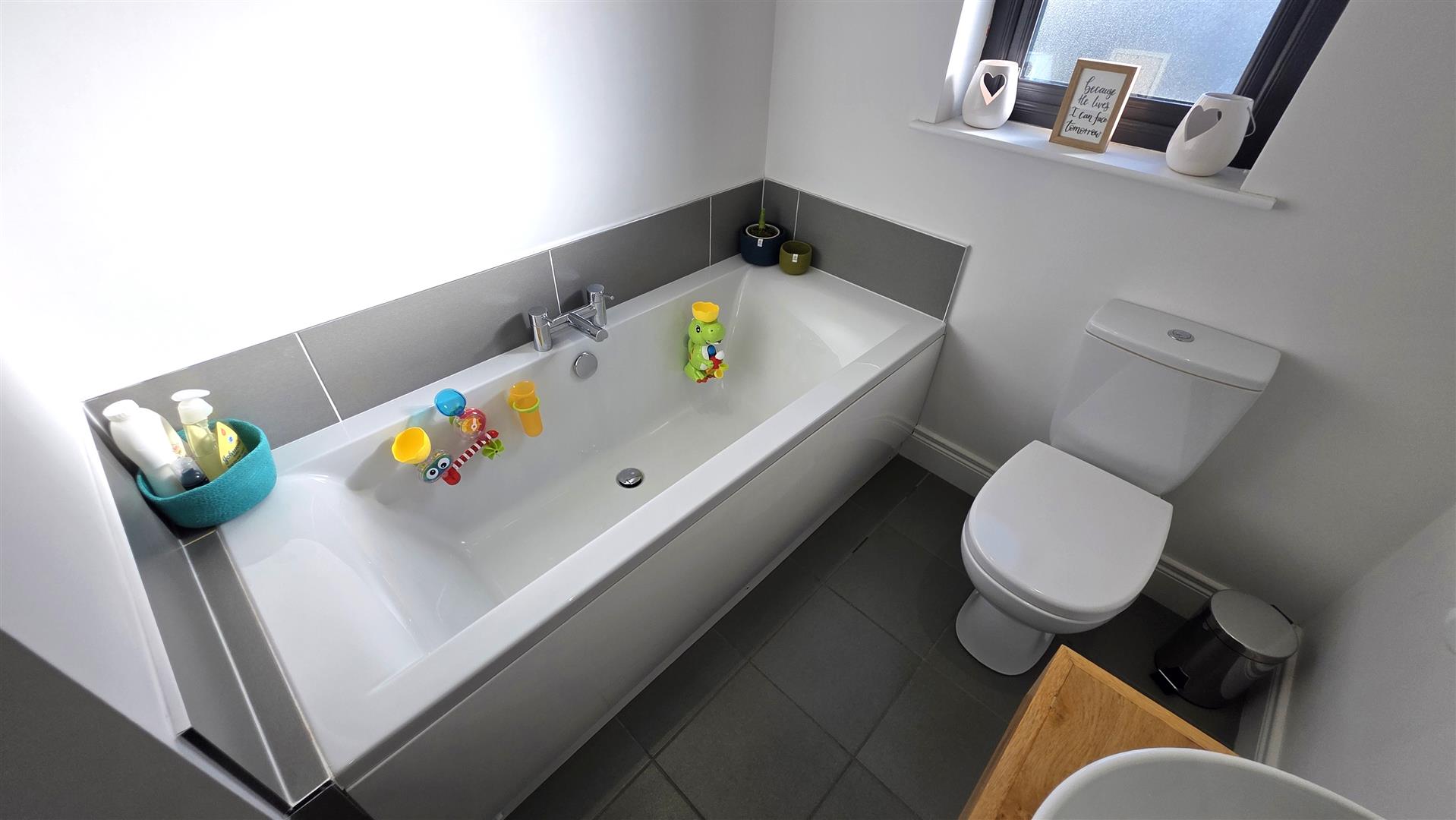 Four piece bathroom with modern white suite to include panel bath and fully tiled shower cubicle