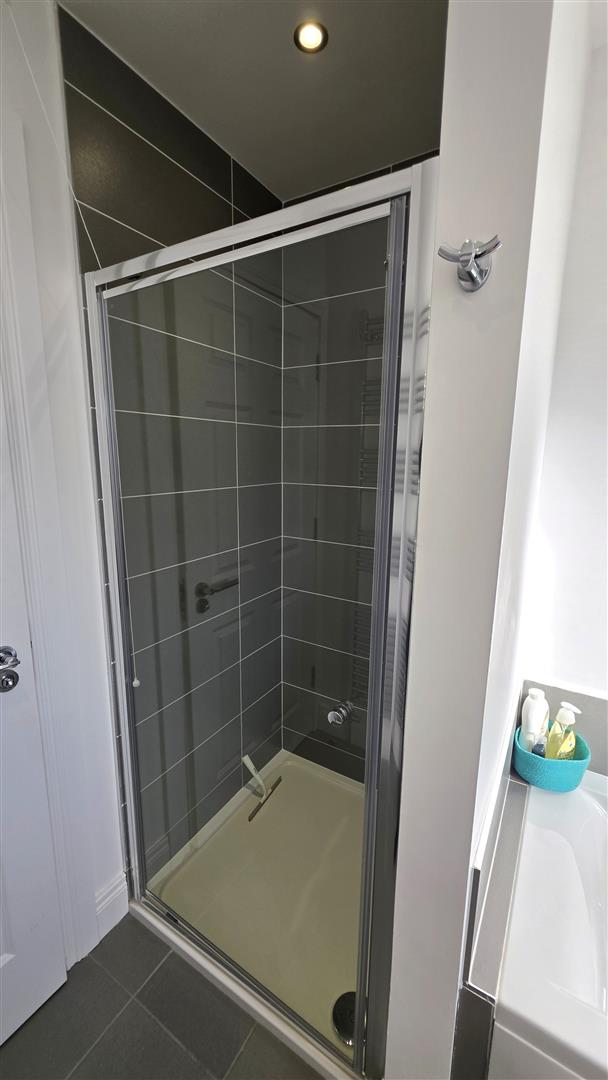 Modern white, four piece suite comprising a double ended panel bath with feature chrome mixer tap and tiled splashback. A wall to wall enclosed shower with fully tiled splashback and partially glazed door. Contemporary, luxury countertop style basin unit with high rise waterfall chrome mixer tap and tiled splashback. Low flush push button WC. Fully tiled flooring. Low voltage down lighting. Extractor fan. Chrome towel radiator.