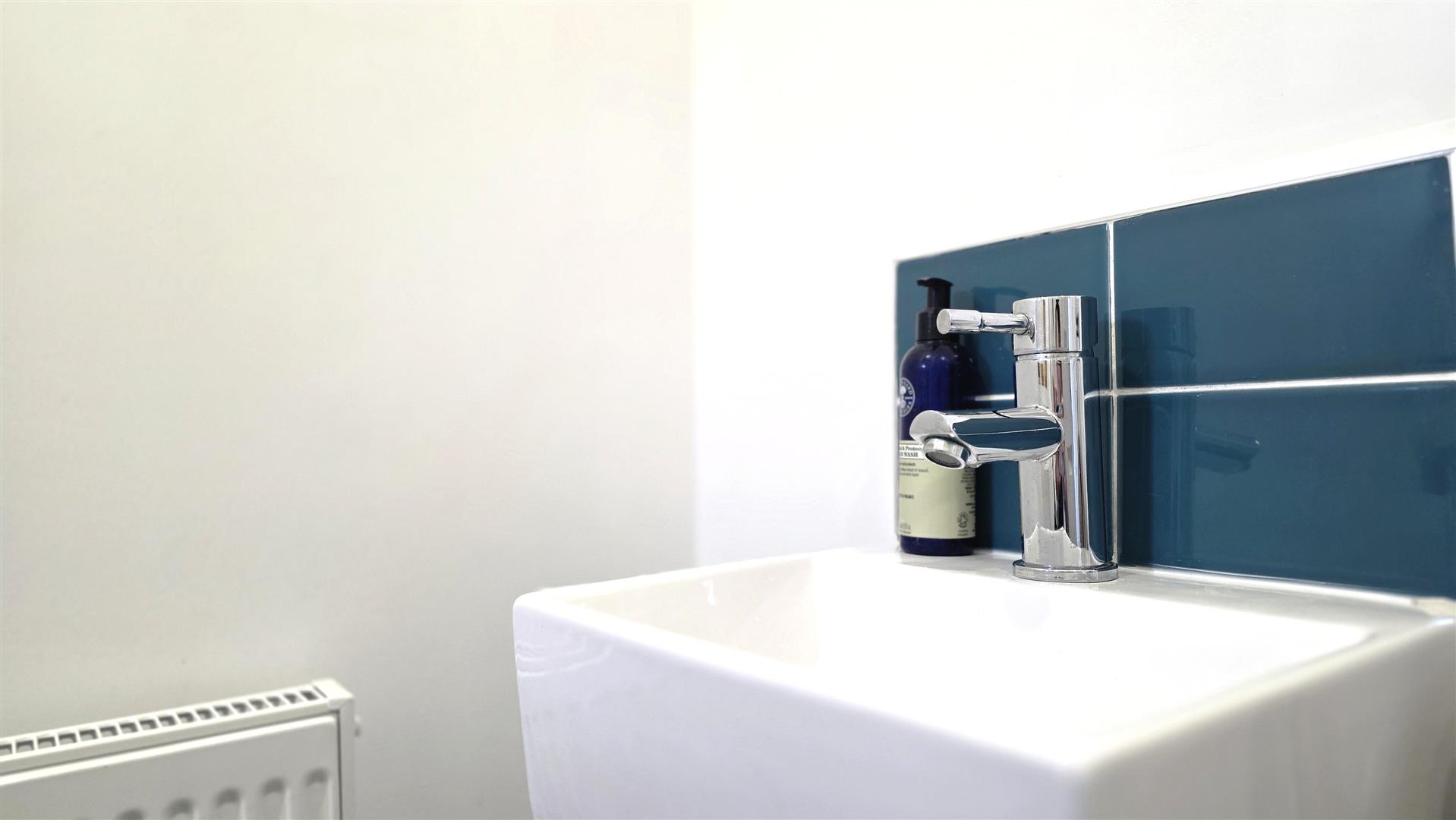 Modern white suite comprising a wall mounted wash hand basin with 'monobloc' chrome mixer tap and tiled splashback. Low flush push button w c. Fully tiled flooring. Single radiator.
