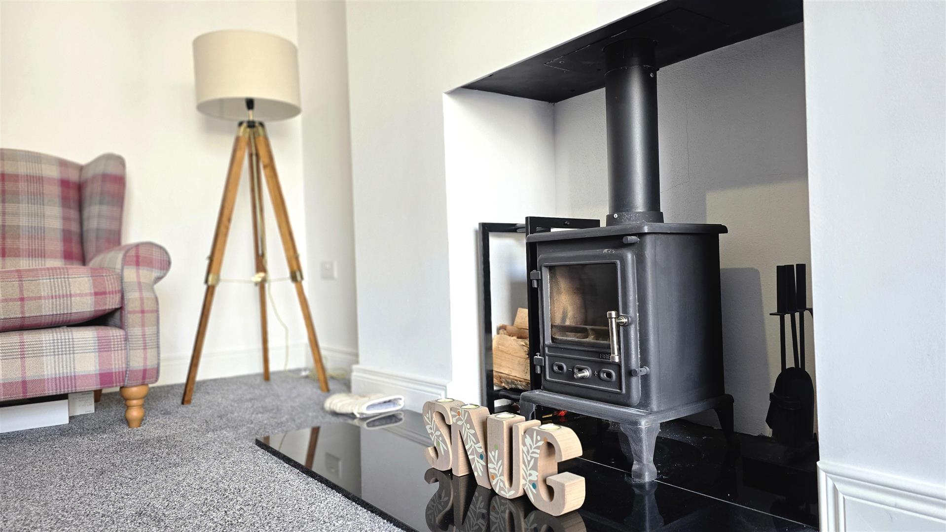 Feature 'Inglenook' multifuel stove with polished granite hearth. Large picture window. Double radiator.