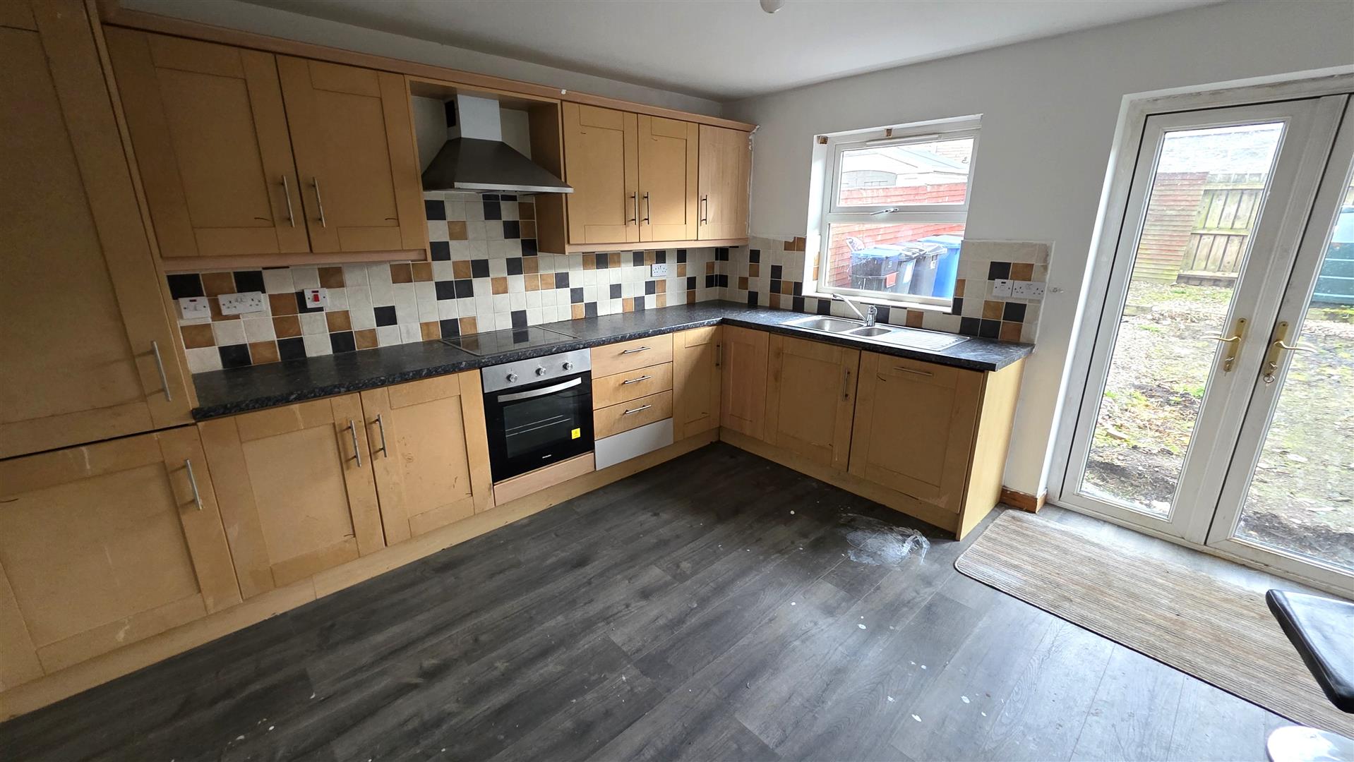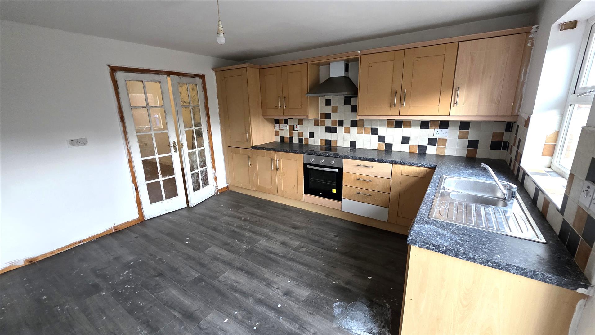 Full range of beech effect "Shaker" style high and low level units with complimentary work surfaces. One and a quarter bowl single drainer stainless steel sink unit with chrome mixer tap. Integrated four ring halogen hob with stainless steel pyramid style over head extractor fan. Low level combination oven and grill, fridge freezer and dishwasher. Part tiled walls to work surfaces. Double radiator. PVC double glazed French doors to rear.