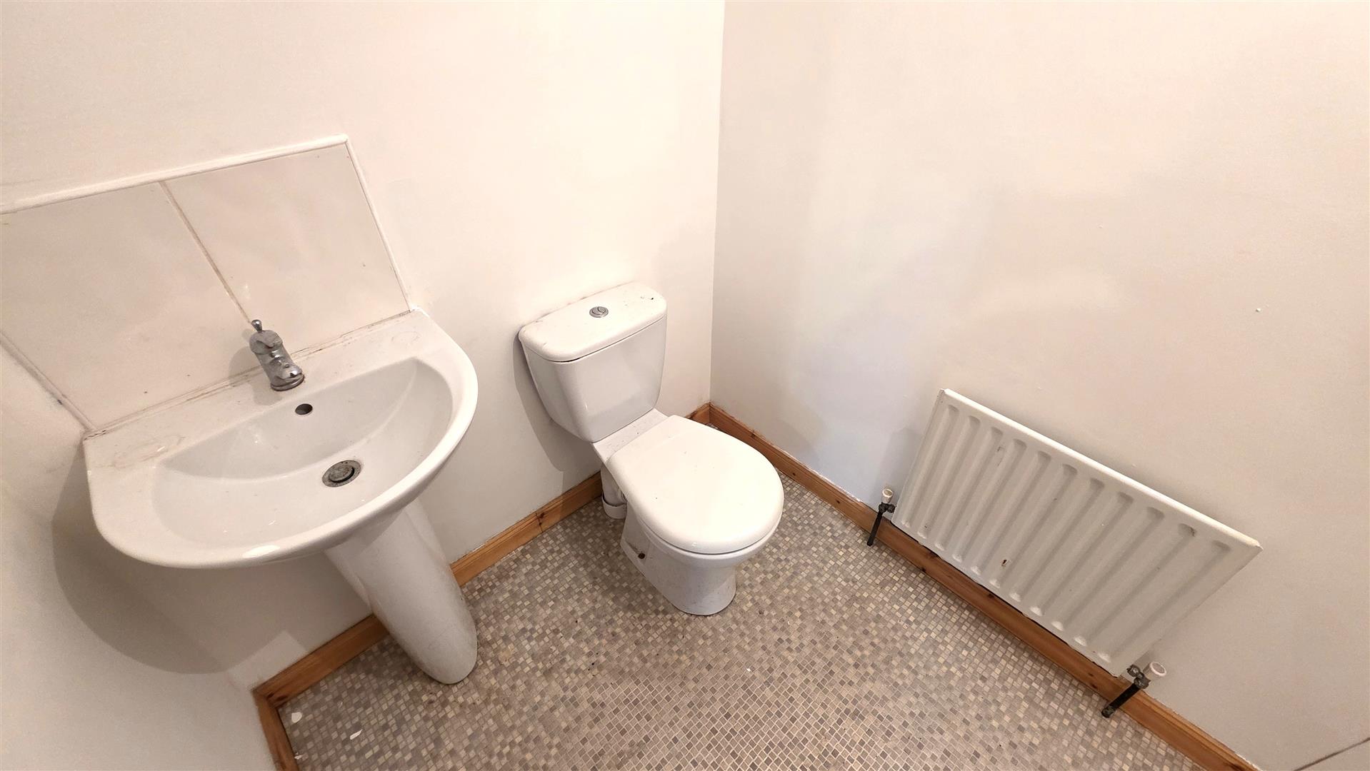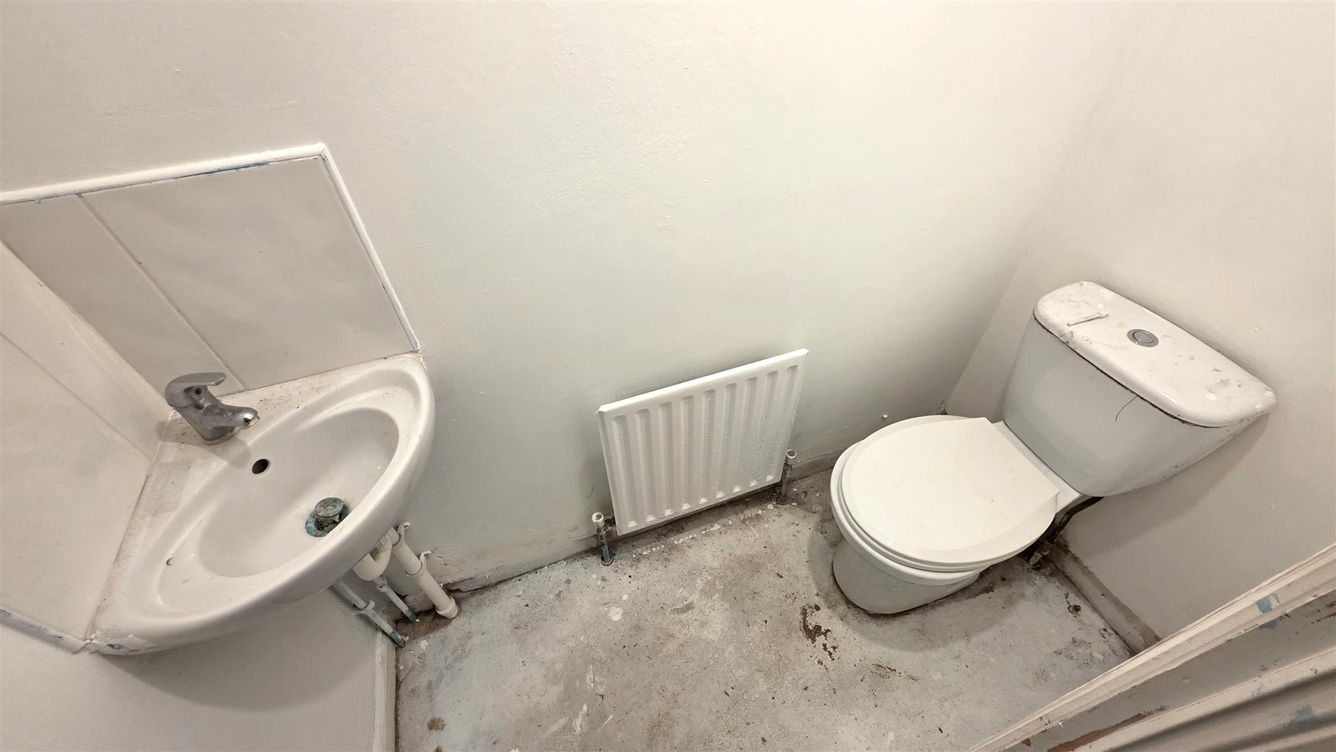 Push button low flush W/C. Corner wash hand basin with "monobloc" mixer tap and tiled splash back. Extractor fan. Single radiator.