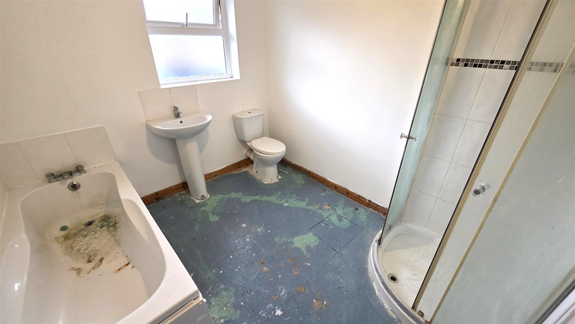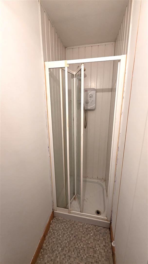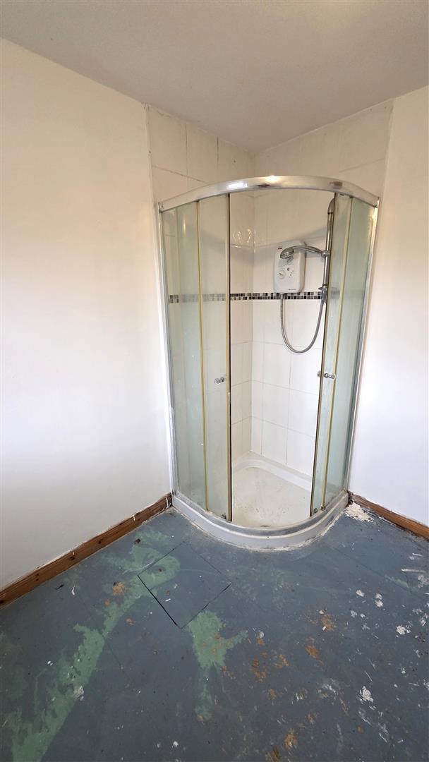 White suite comprising wall to wall shower with "Aqua Profile Plus" electric shower and glazed folding door. Push button low flush W/C and pedestal wash hand basin with "monobloc" mixer tap and tiled spalsh back. Extractor fan. Single radiator.