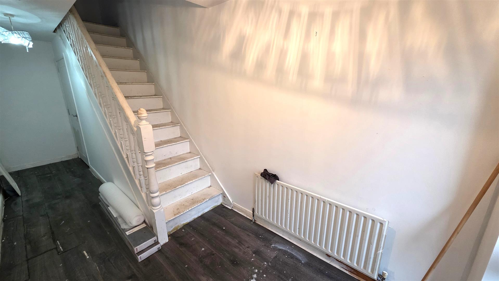 Wood laminate floor. Single radiator. Staircase to first floor with moulded handrail and turned balustrade.