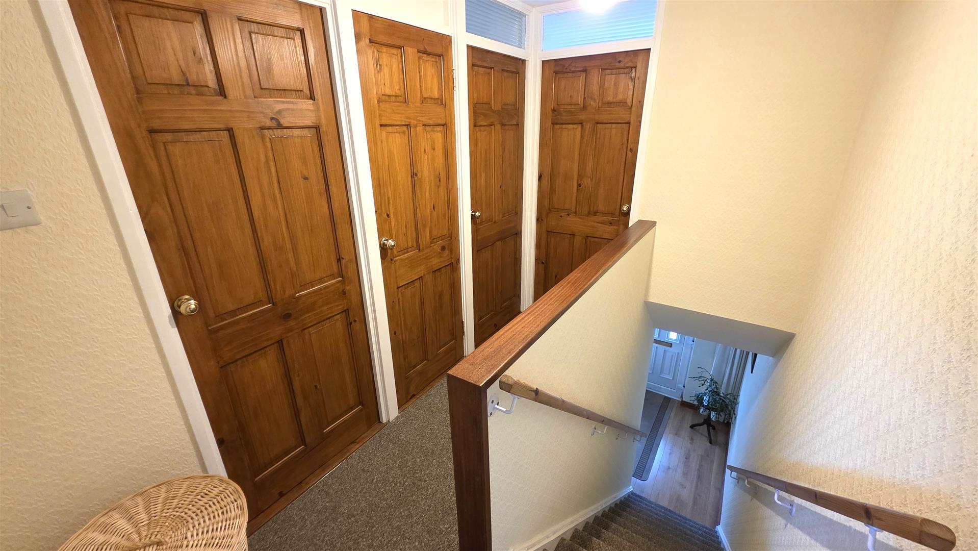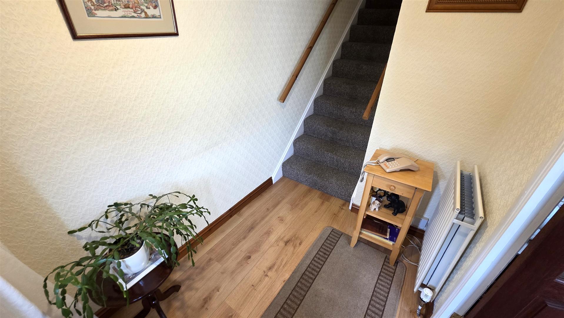 Staircase to first floor with two handrails. Wood laminate flooring. Double radiator. 6 panel bevelled glass door to;
