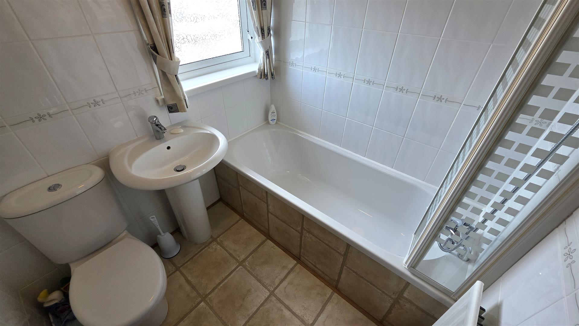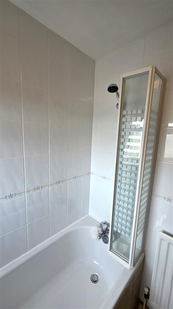 Modern white suite comprising a panel bath with chrome hot and cold taps, shower over and partially glazed folding door. Pedestal wash hand basin with 'Monobloc' chrome mixer tap. Low flush push button WC. Fully tiled walls. Extractor fan. Single radiator.
