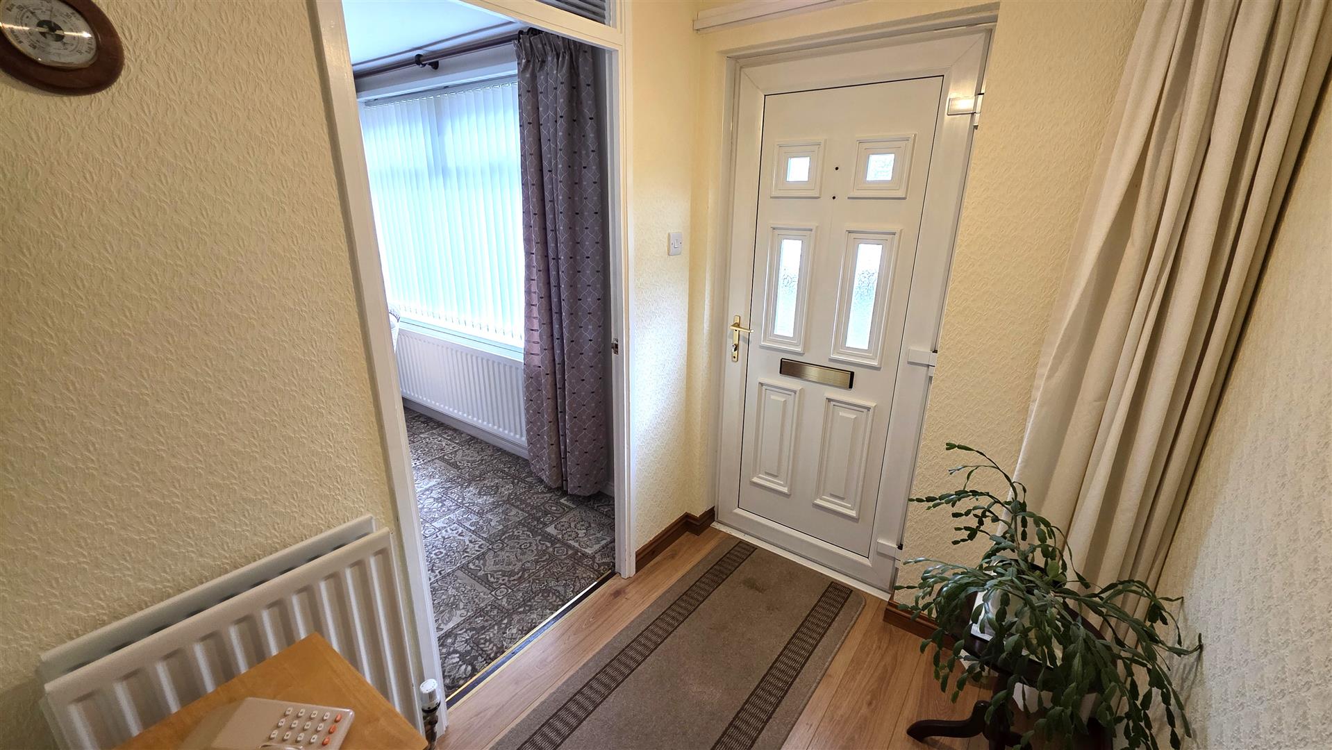 Feature electric fire with decorative mahogany surround. Double radiator. 6 panel bevelled glass door to;