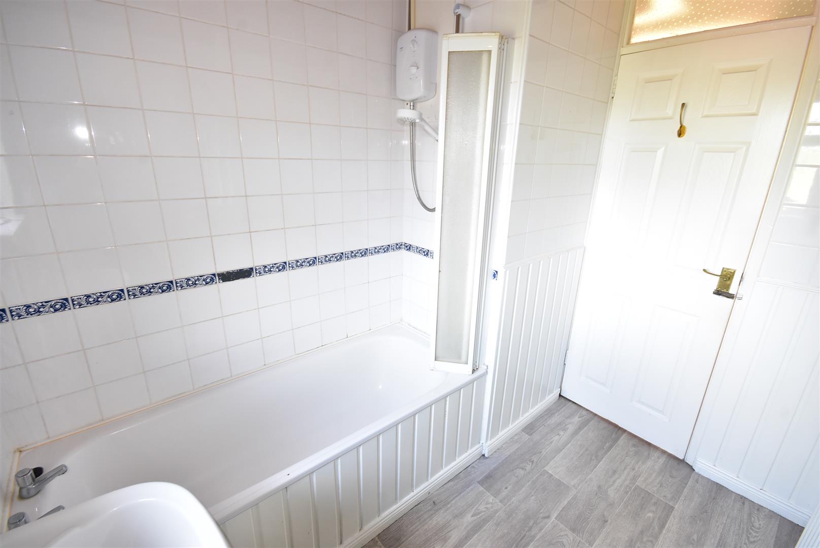 White suite comprising panel bath with "Triton Enrich" electric shower over. Low flush W/C and pedestal wash hand basin. Part tiled walls with decorative border. Part wood strip walls. Wood strip ceiling. Double radiator.