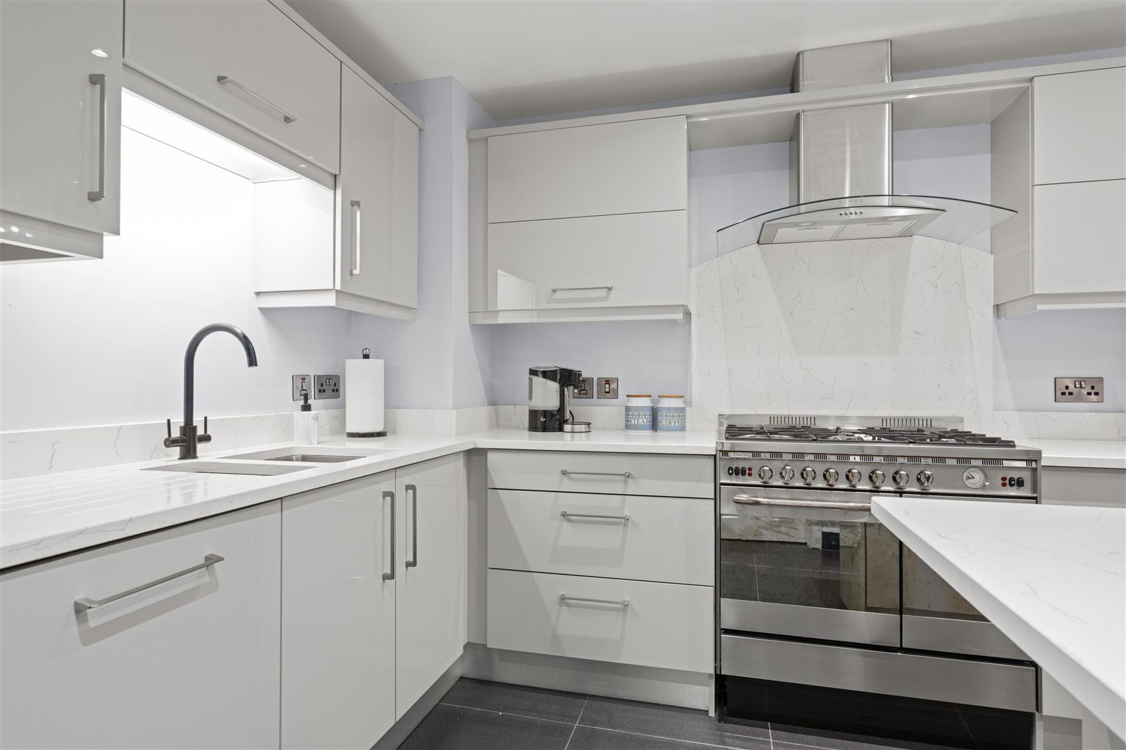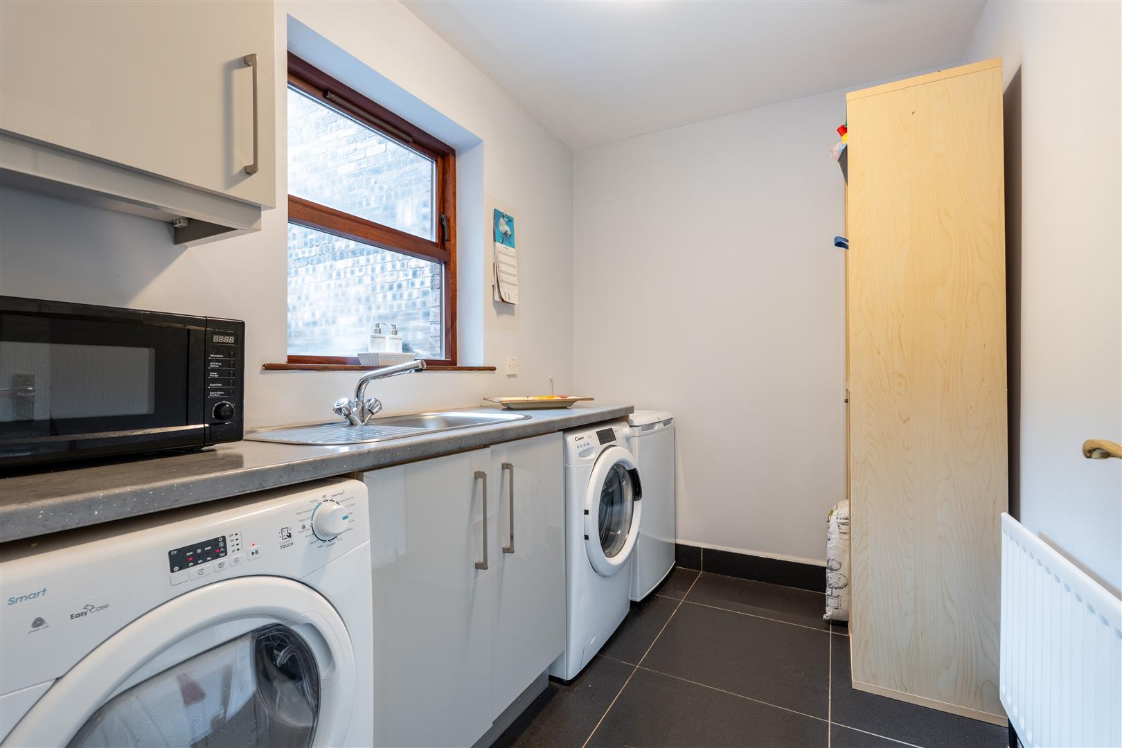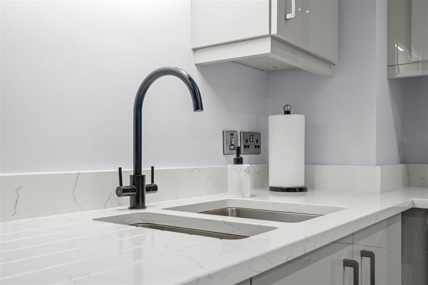 Matching grey coloured high gloss high and low level units with complimentary work surfaces. Single drainer stainless steel sink unit with mixer taps. Plumbed for washing machine and space for dryer and fridge freezer. Fully tiled floor and tiled skirting. Single radiator.