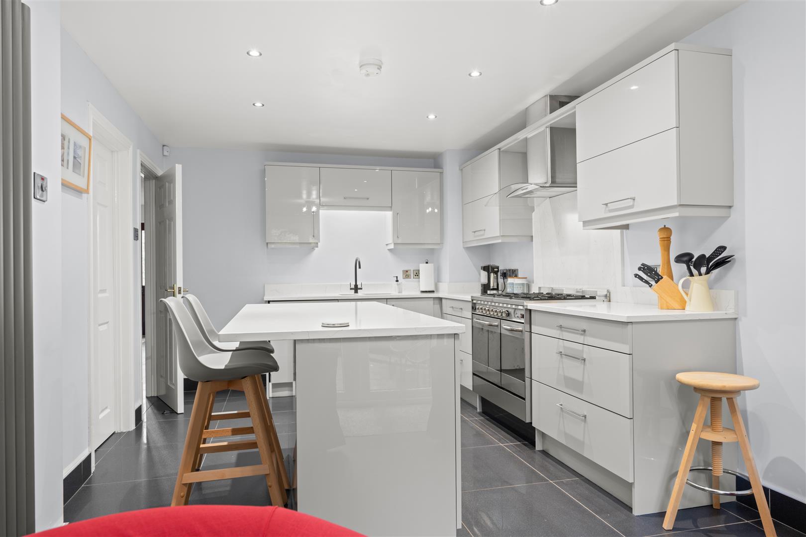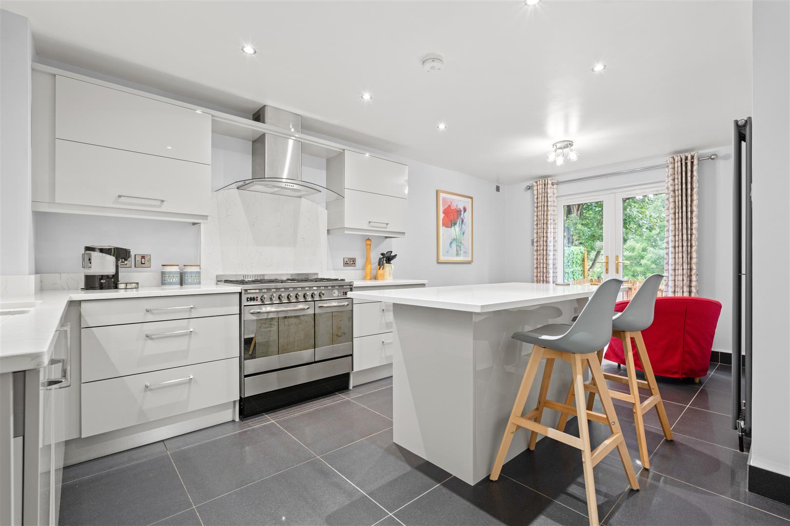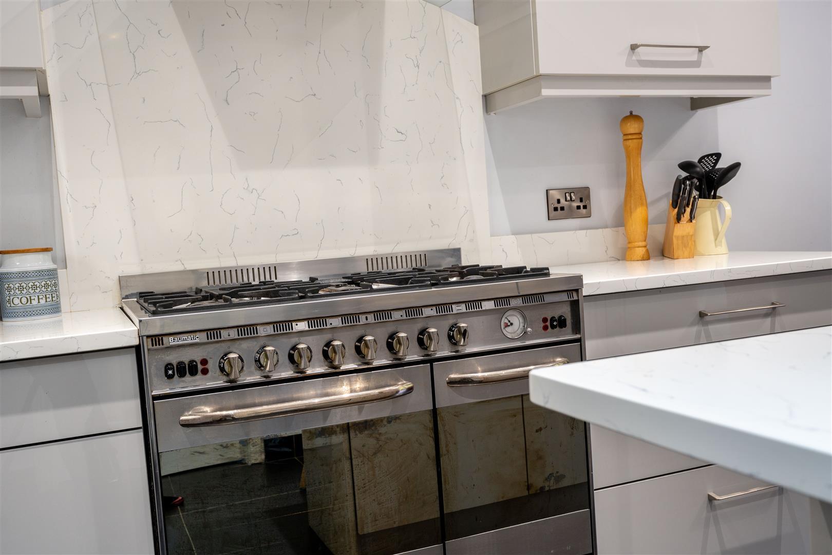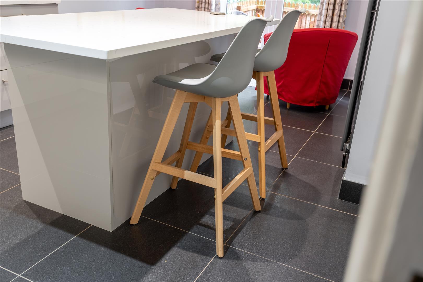 Full range of contemporary style, grey coloured high gloss high and low level units with feature polished granite work surfaces. Inlaid one and a quarter bowl stainless steel sink unit with mixer taps and flutted granite drainer. Baumatic stainless steel range cooker with gas hob and dual electric ovens with overhead extractor fan. Integrated dishwasher. Polished granite centre island with breakfast bar seating area and low level storage cupboards. Pull-up three gang electric bar with two USB ports. High level, wall mounted TV point. Fully tiled floor and tiled skirting. Low voltage downlights. Graphite coloured upright designer radiator. PVC double glazed French doors to rear.