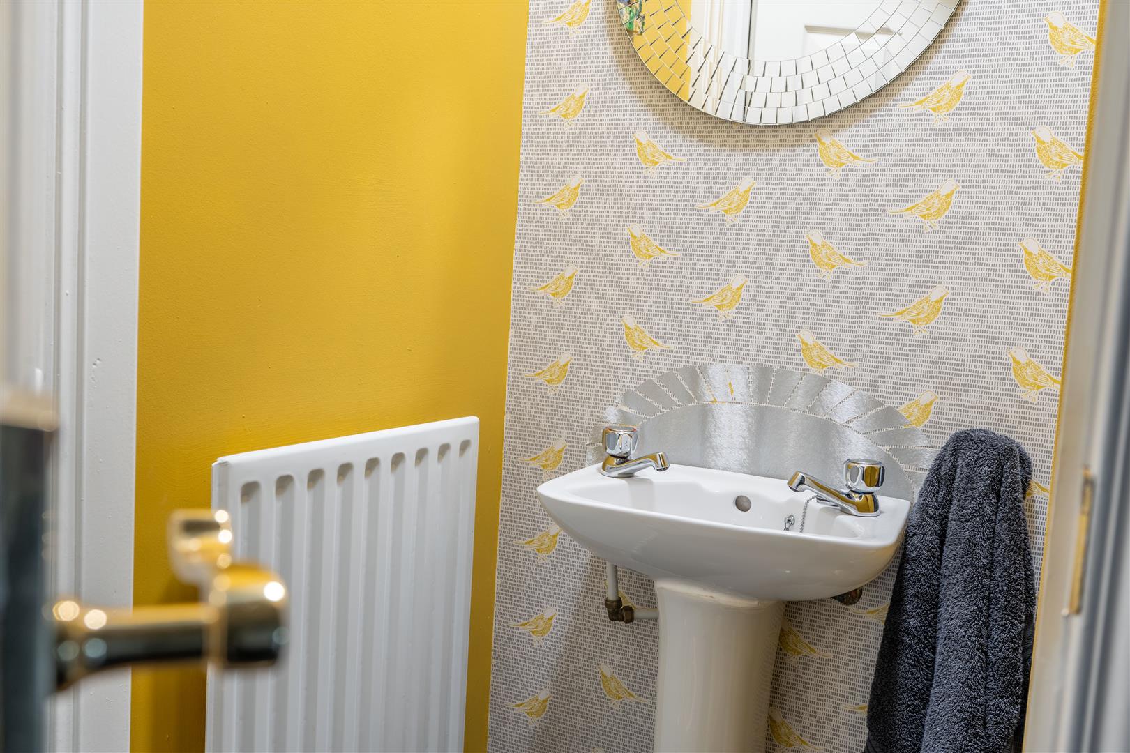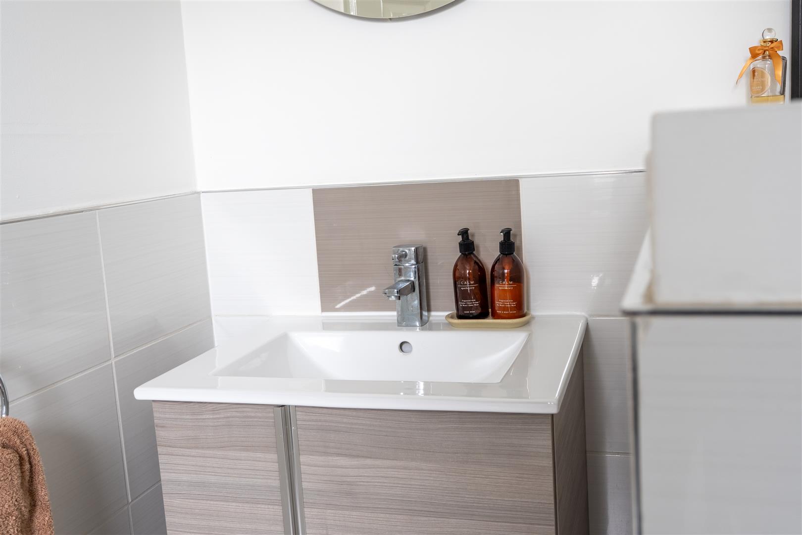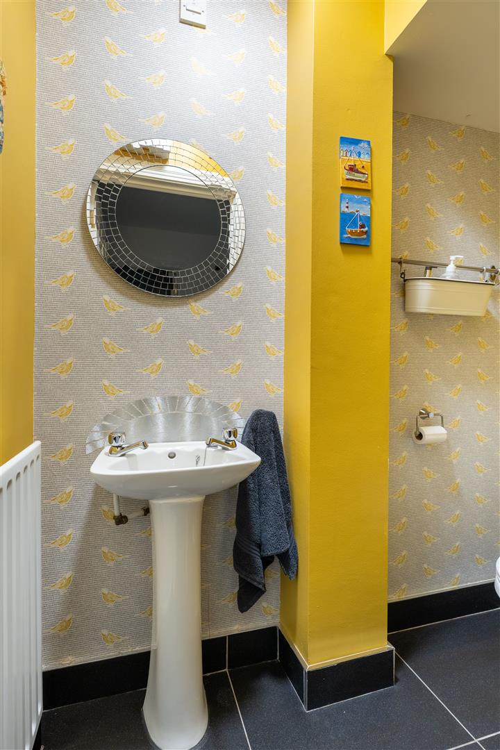 Modern white suite comprising low flush W/C and pedestal wash hand basin. Fully tiled floor and tiled skirting. Extractor fan. Single radiator.