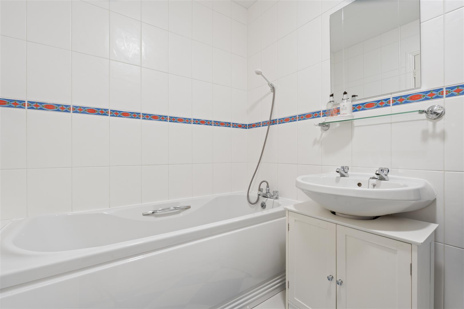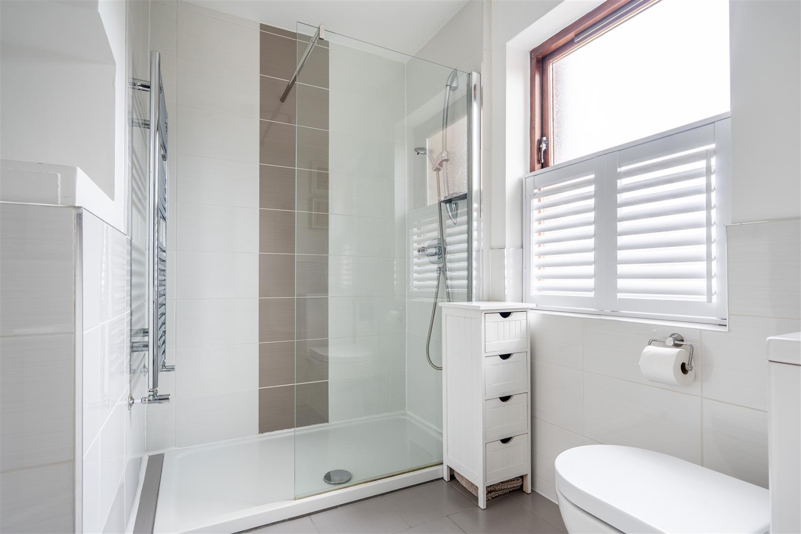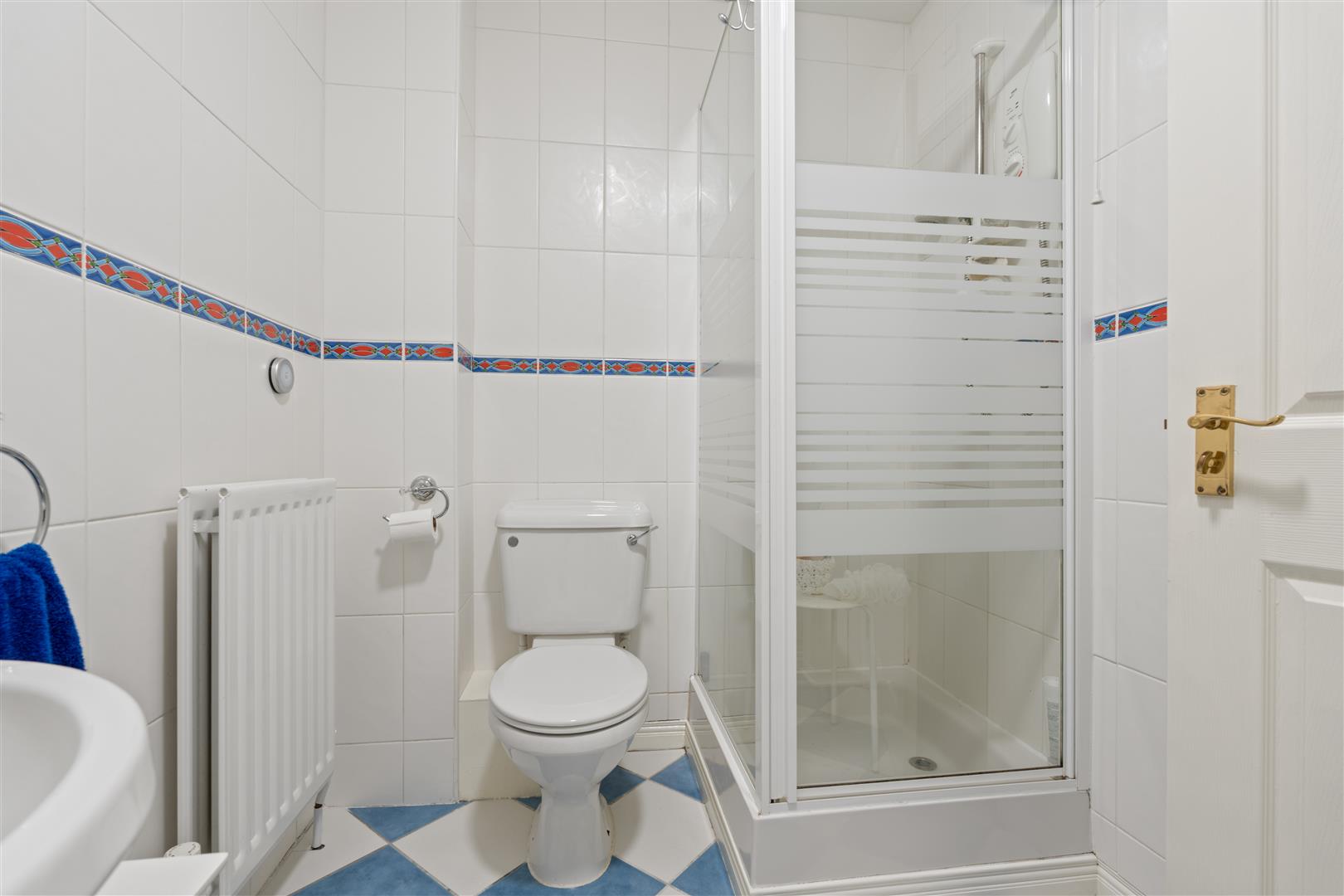 Modern white suite comprising panel bath with mixer taps and shower attachment. Low flush W/C, pedestal wash hand basin and fully tiled shower cubicle with "Mira Sport" shower unit and pivot glass door. Fully tiled walls with decorative border. Fully tiled floor. Extractor fan. Single radiator.