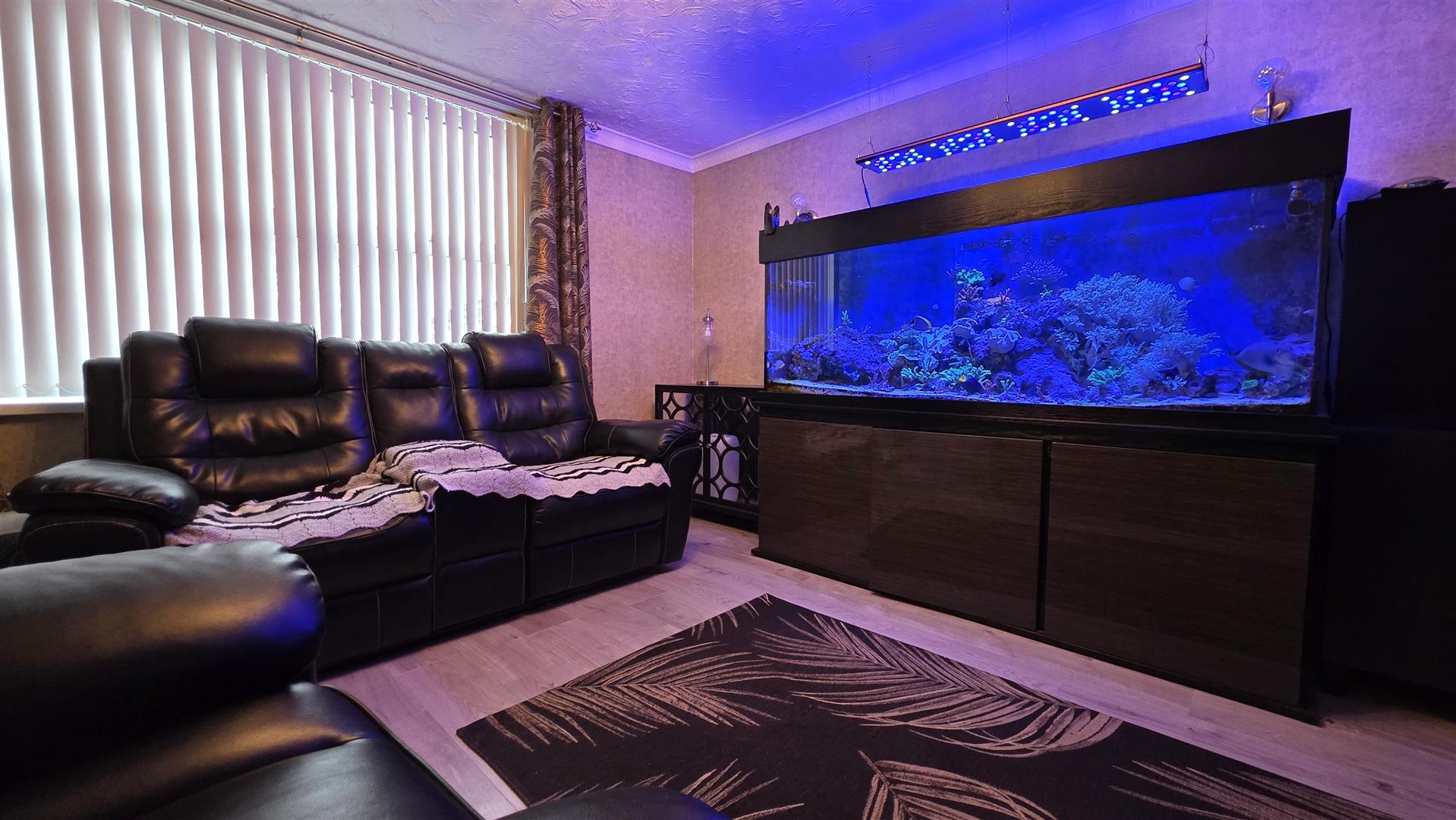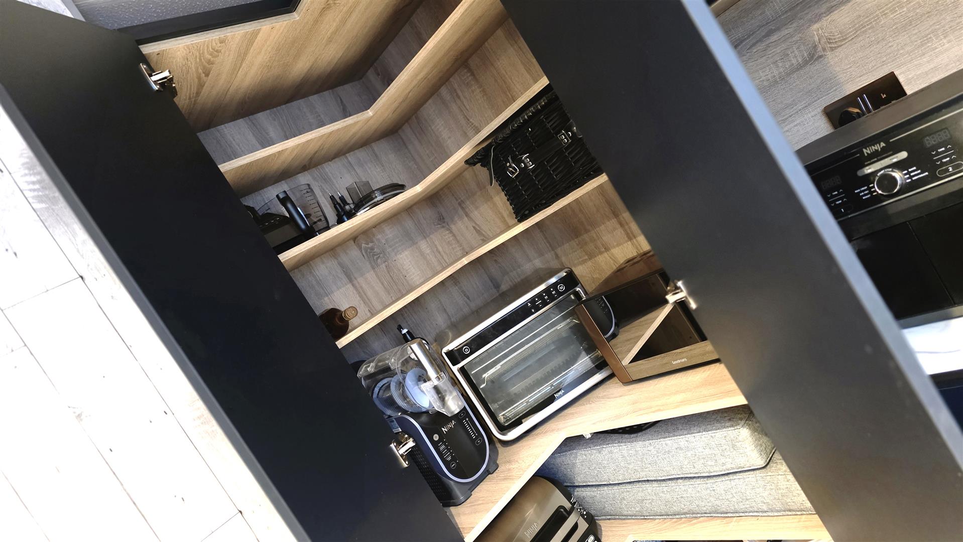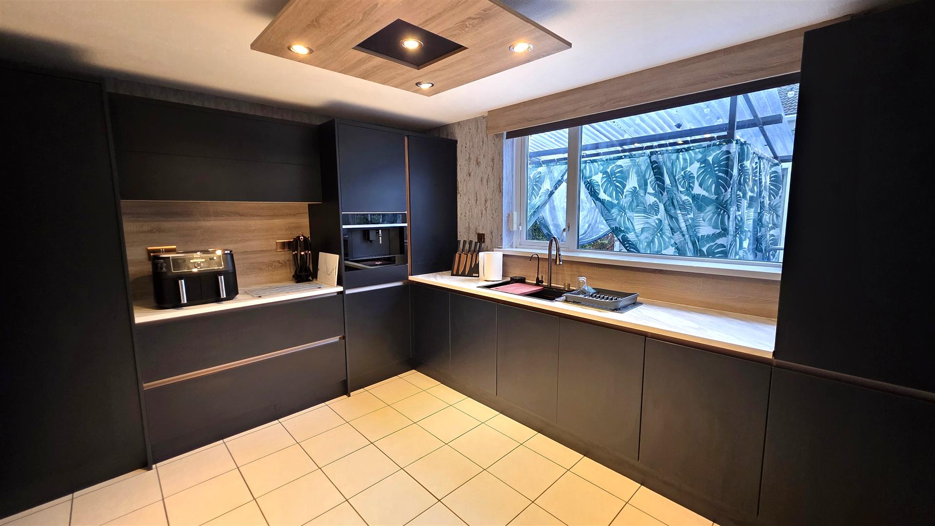 Full range of indigo blue and copper handle less contemporary style high and low level kitchen units with white marble effect work surfaces and oak effect splashback stands. One and a quarter bowl composite sink with integrated shower mixer tap, waterfall vegetable washer, pressurised glass cleaner and filter water tap. Integrated 'Whirlpool' bean to cup coffee machine. Large larder cupboard. Lighting pelmet with low voltage downlights. Fully tiled floor. Double radiator. Separate utility area with grey contemporary style high and low level units. Space for a washing machine and American style fridge freezer. Double glazed PVC door to the rear.