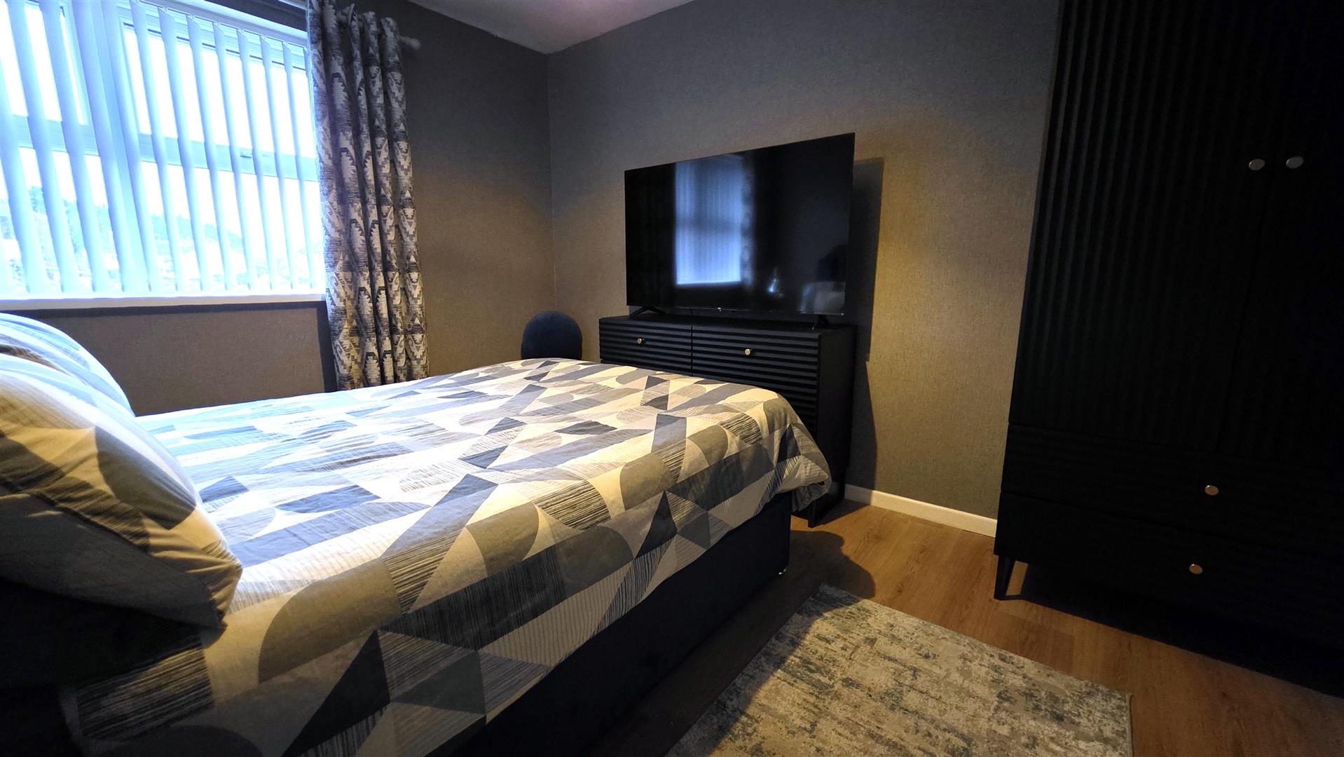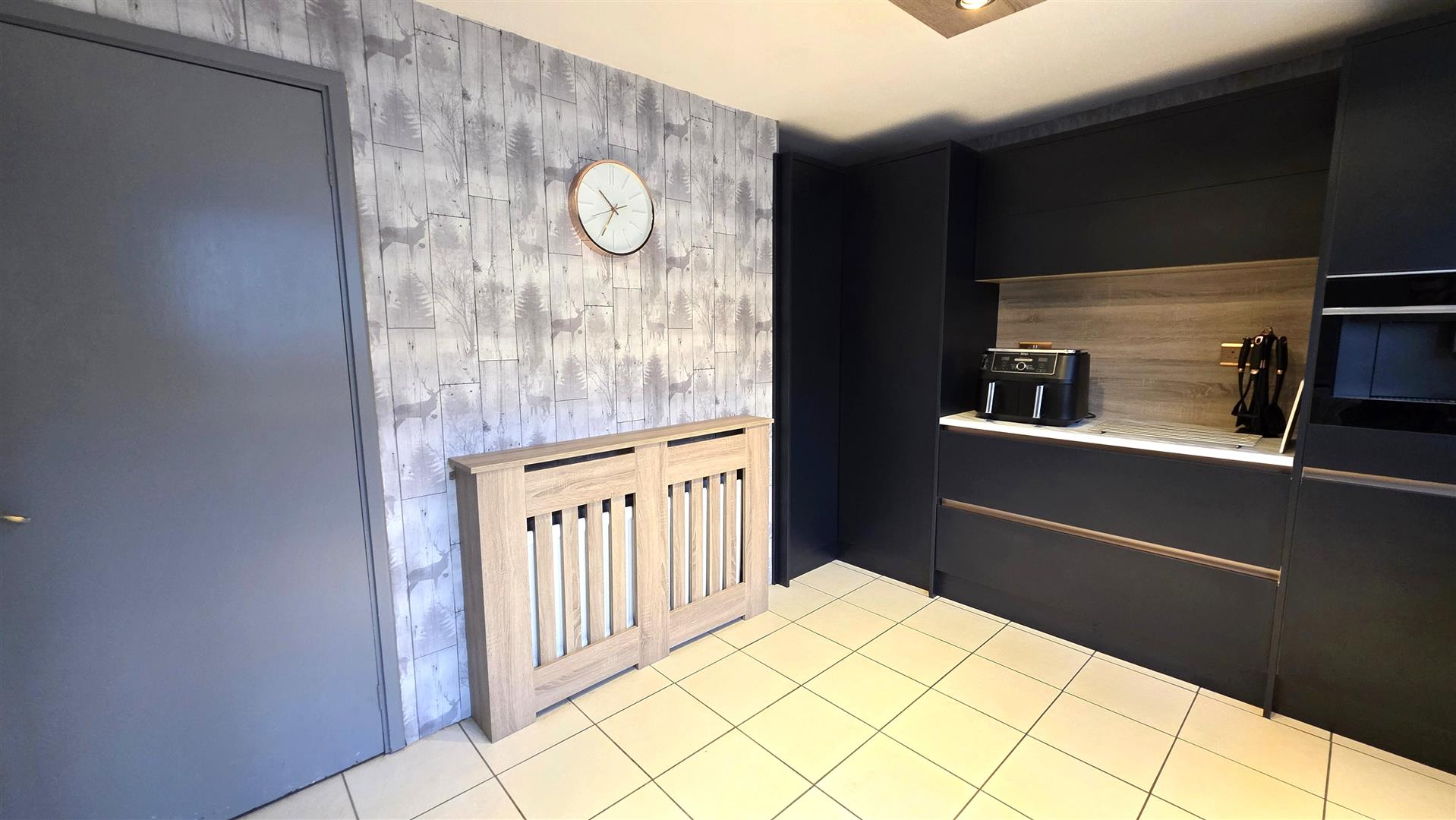 Wood laminate flooring. Integrated storage. Single radiator.