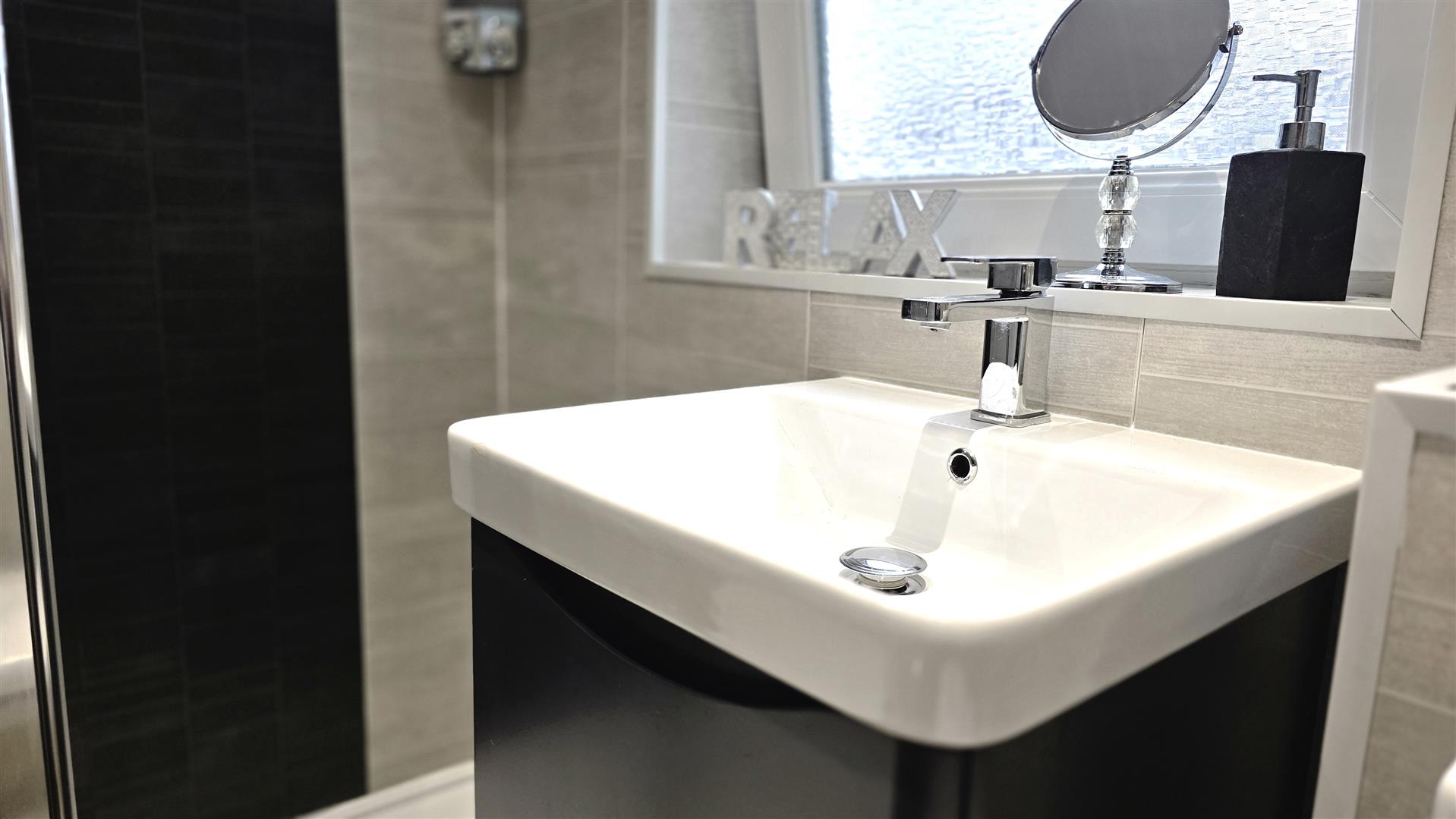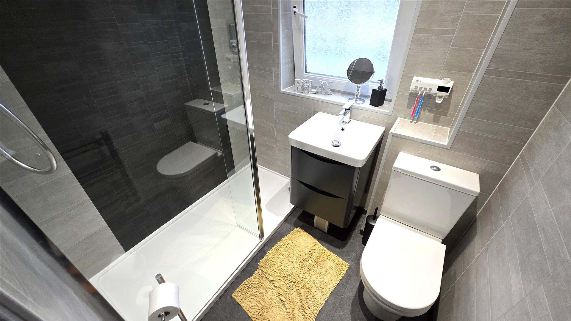 Sliding door to luxury shower room with a 1,600mm walk in shower with 'Mira Decor' 10Kw electric shower and glazed screen. Wall mounted wash hand basin with 'Monobloc' chrome mixer tap and storage below. Low flush push button WC. PVC laminate flooring. Low voltage downlighting. Extractor fan. Graphite towel radiator.