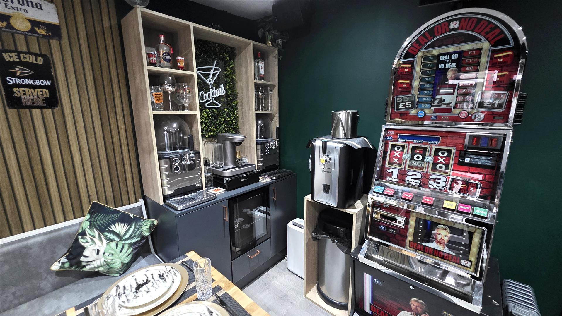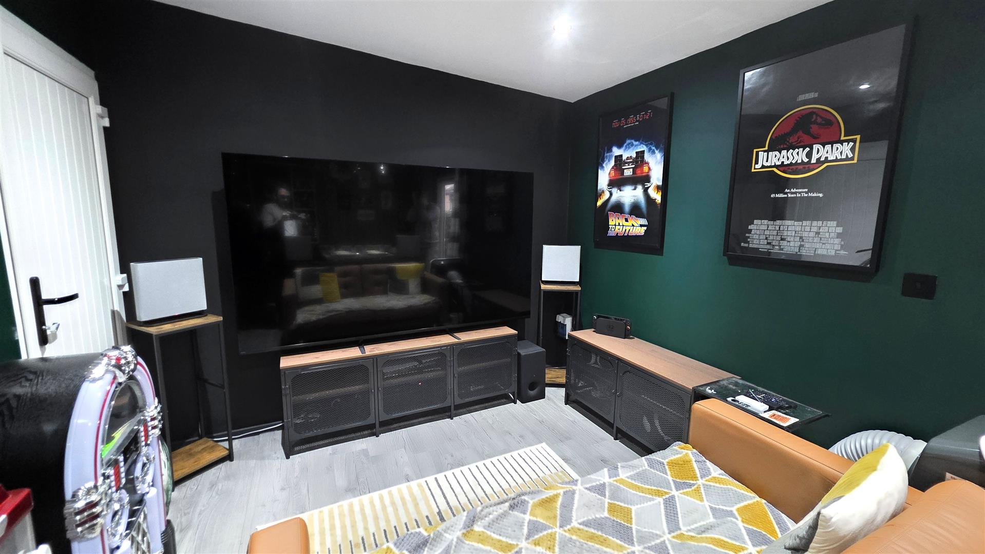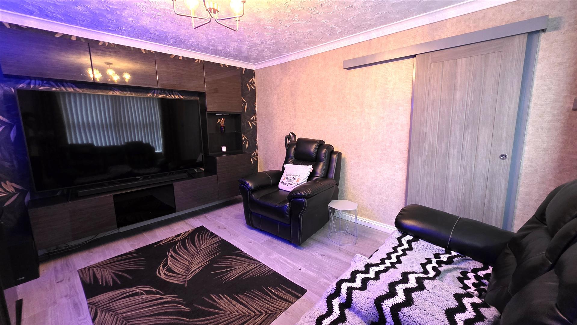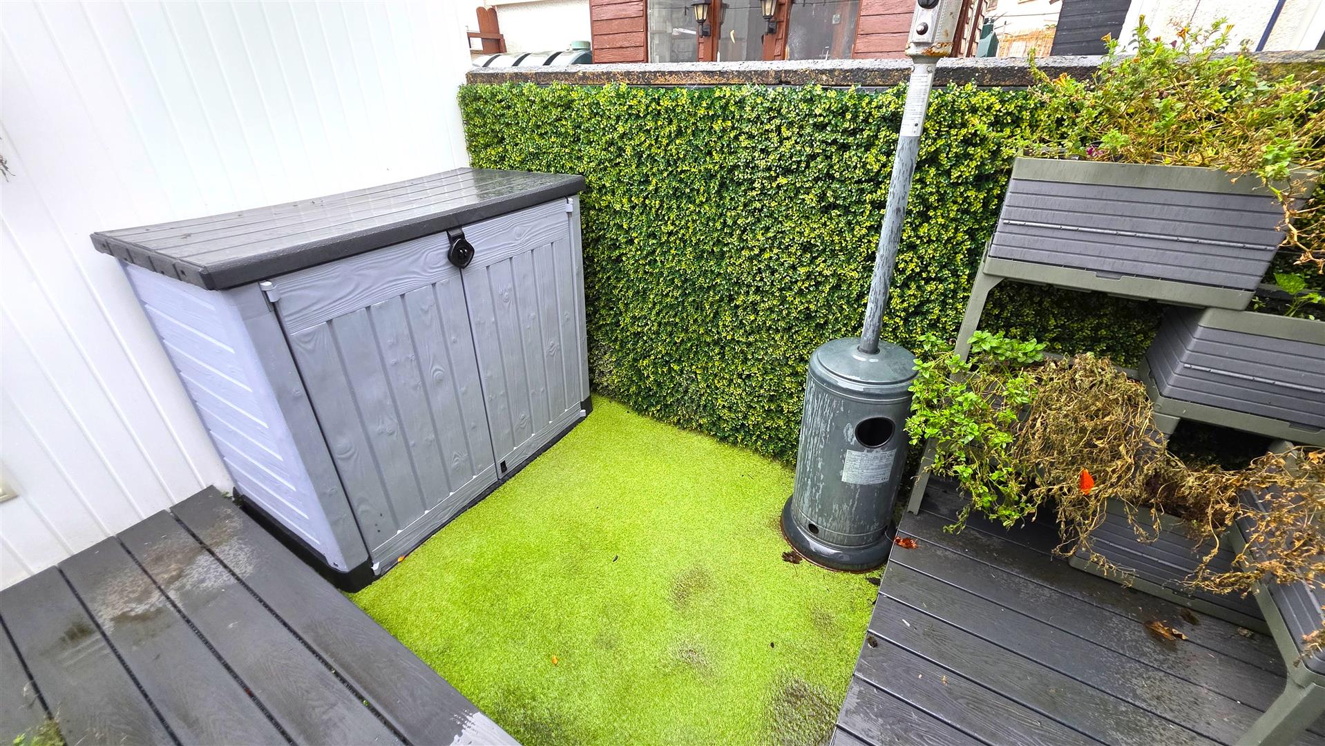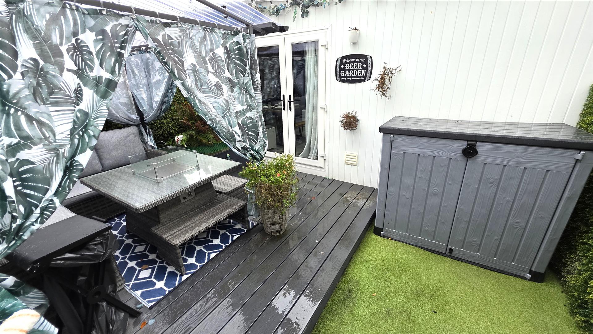 Fully enclosed rear garden with artificial neat lawn, composite decking and outside power and lighting. Leading to;