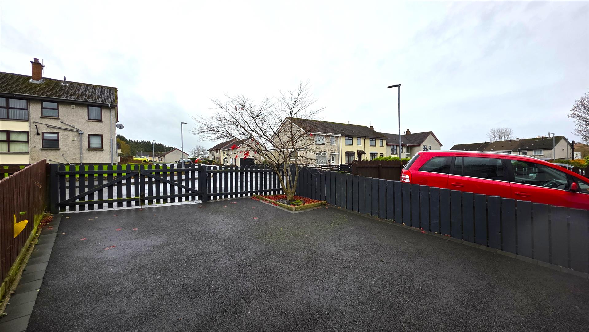 Fully enclosed front garden with timber fencing and gate to the front. Tarmac driveway with 7Kw electric car charger.