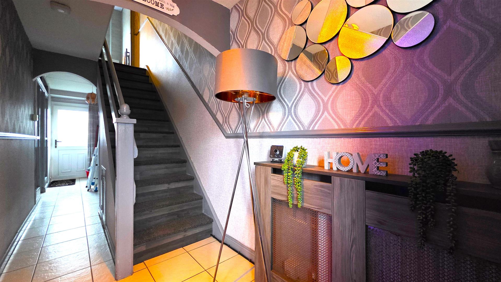 Staircase to first floor with handrail. Fully tiled floor. Sliding door to;