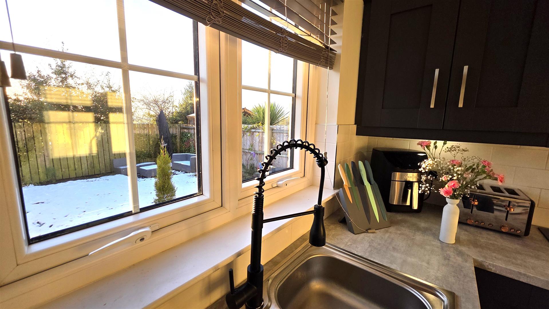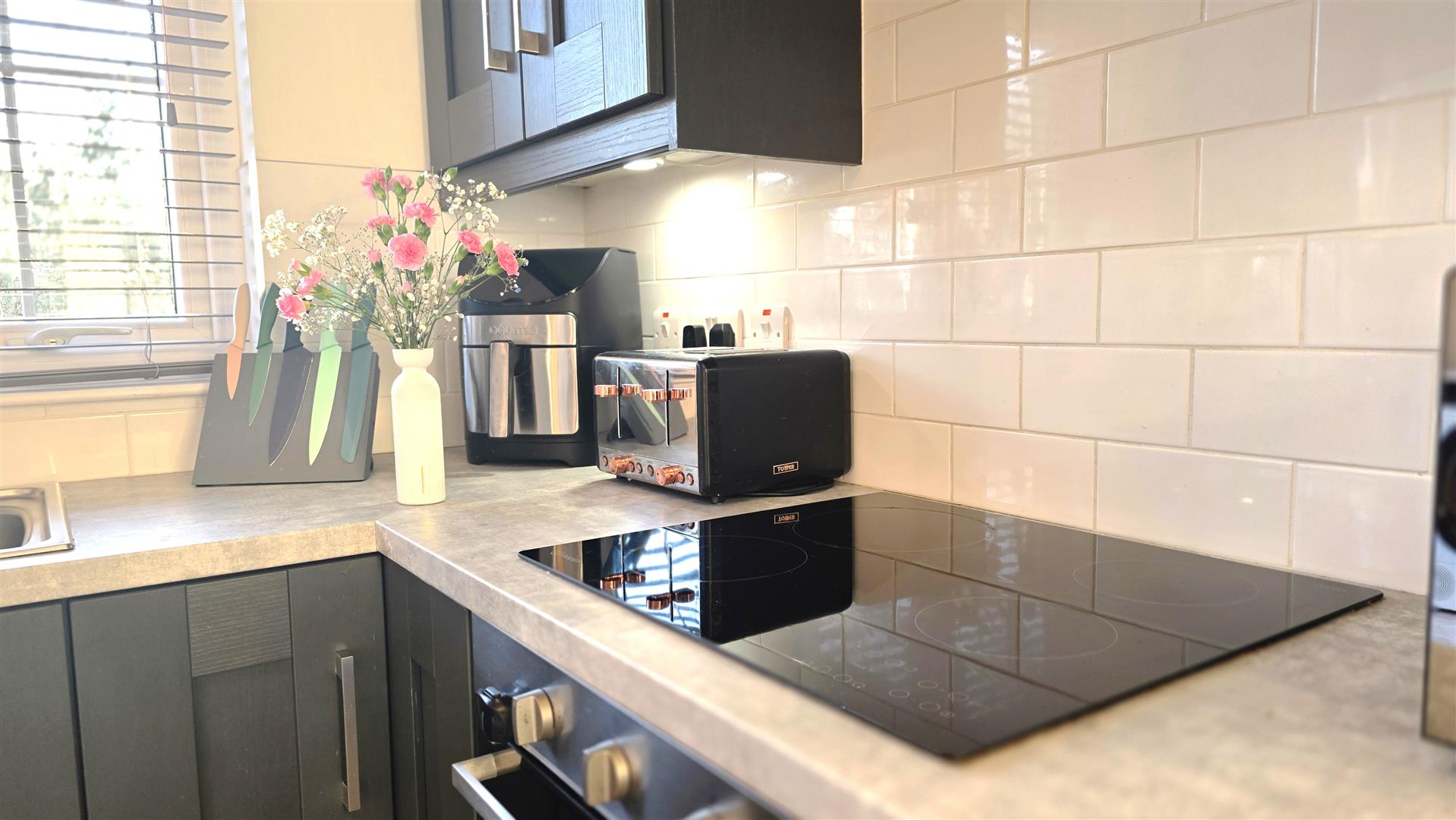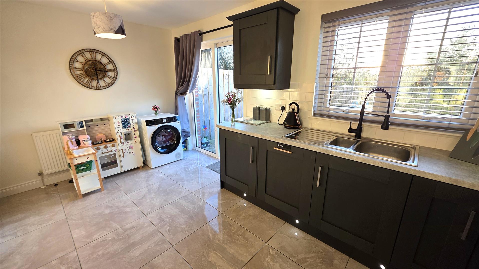Fully fitted range of dark blue 'Shaker' style high and low level kitchen units with contrasting worktops and splashback tiling. Over counter lighting and LED bullet lights to the kickstand. One and a quarter bowl stainless steel sink unit with black mixer shower tap. Integrated four ring halogen hob with stainless steel pyramid style overhead extractor fan and low level combination oven and grill. Integrated fridge freezer, washing machine and dishwasher. Fully tiled floor. Double radiator. PVC double glazed sliding patio door to rear garden.