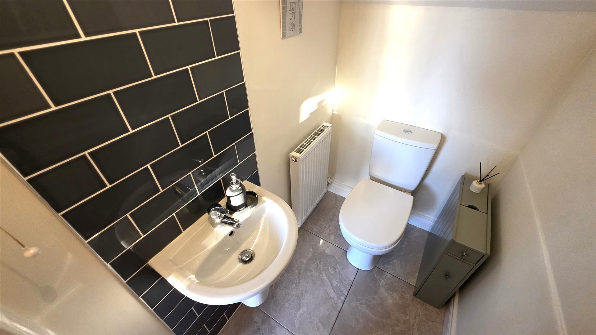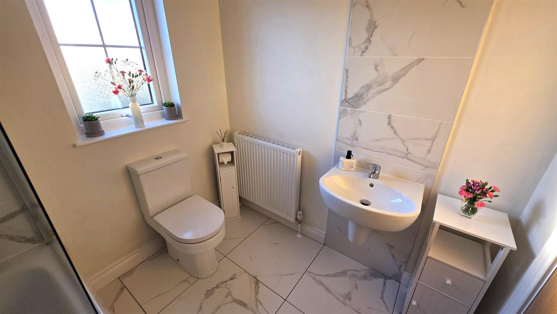 Modern white suite comprising low flush W/C and wall mounted wash hand basin with 'monobloc' mixer tap. Tiled splash back. Fully tiled floor. Single radiator.