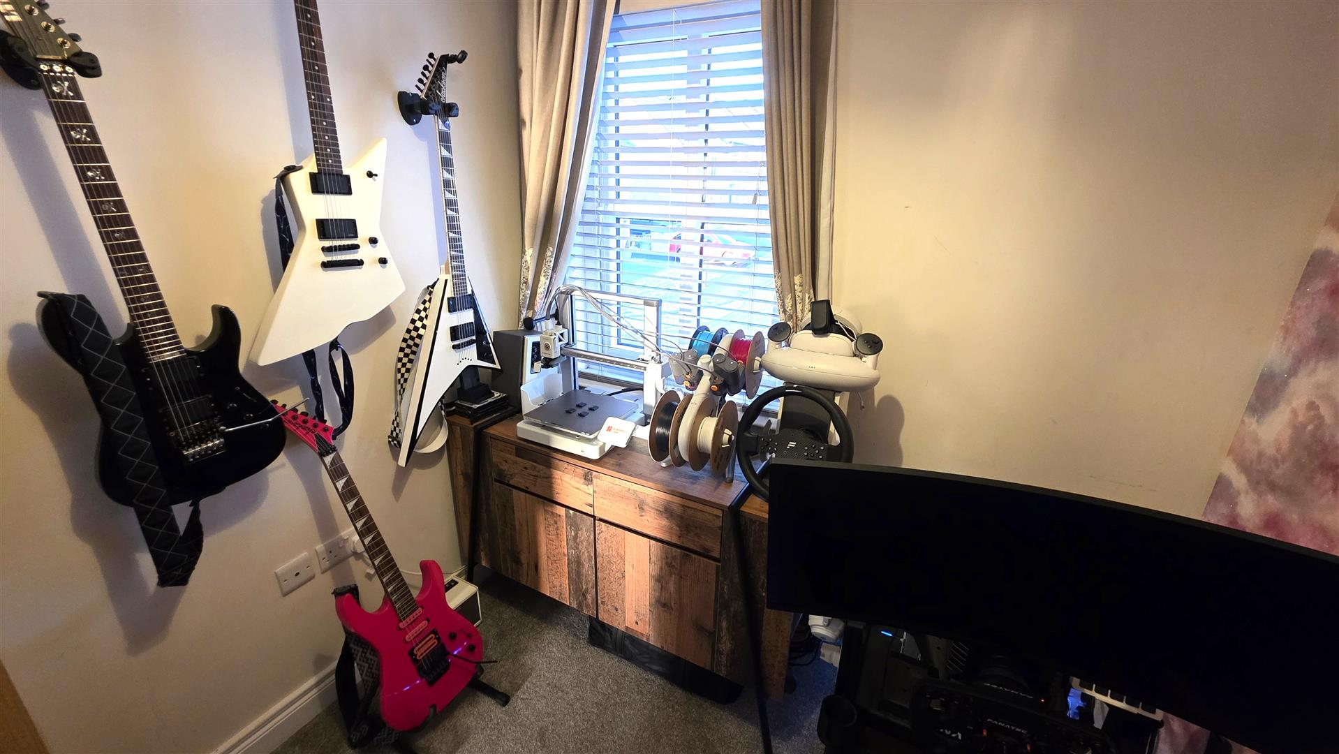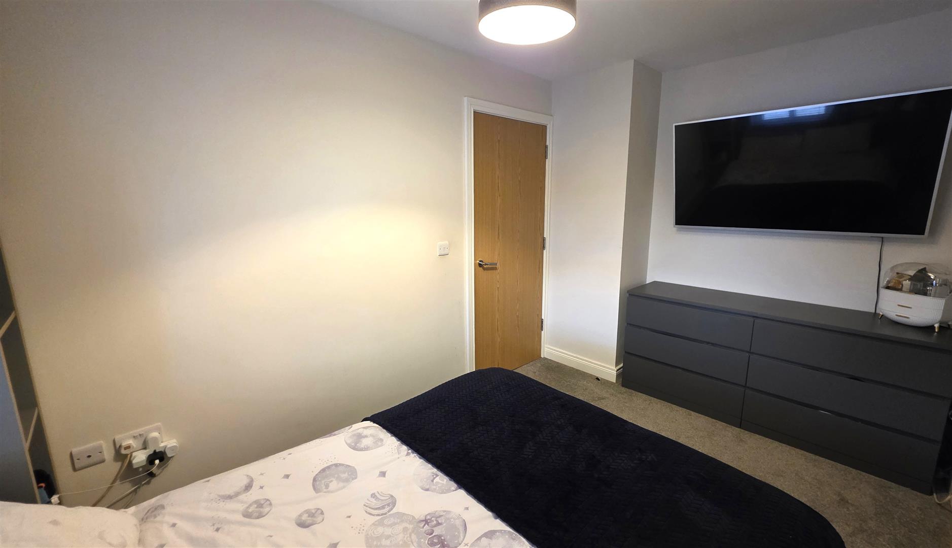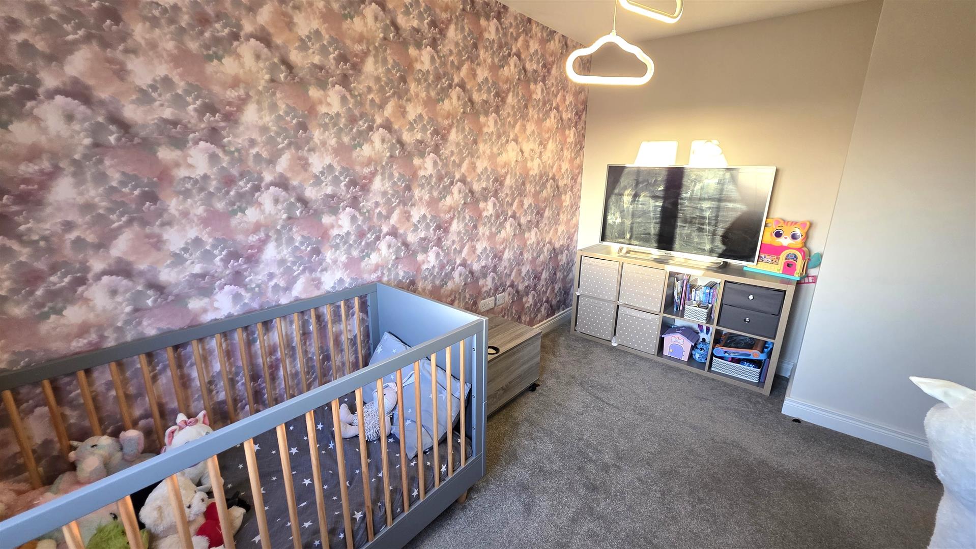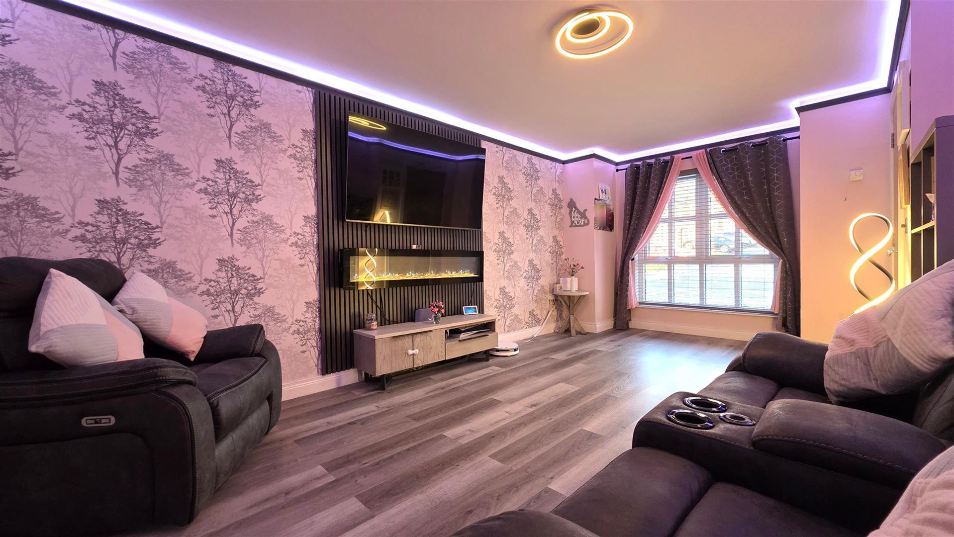 Feature wood panelled walls. Feature media wall with acoustic wall panelling and a contemporary style wall mounted electric fire with LED lighting and wood burning effect. Double radiator.