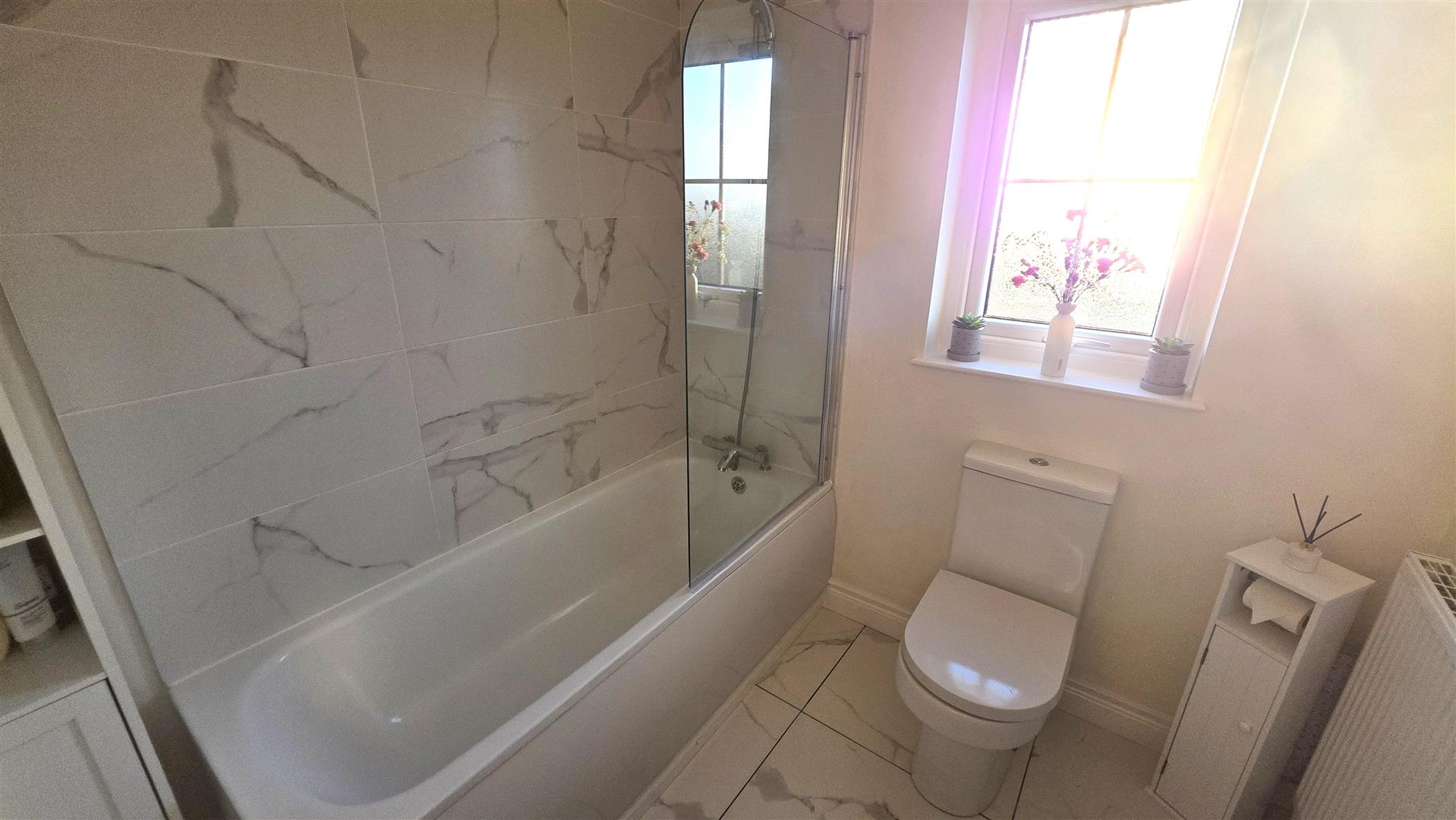 Modern white suite comprising a a panel bath with shower over, feature chrome mixer tap, tiled splashback and glazed screen. Wall mounted wash hand basin with 'Monobloc' chrome mixer tap and floor to ceiling tiled splashback. Low flush push button WC. Fully tiled floor. Extractor fan. Single radiator.