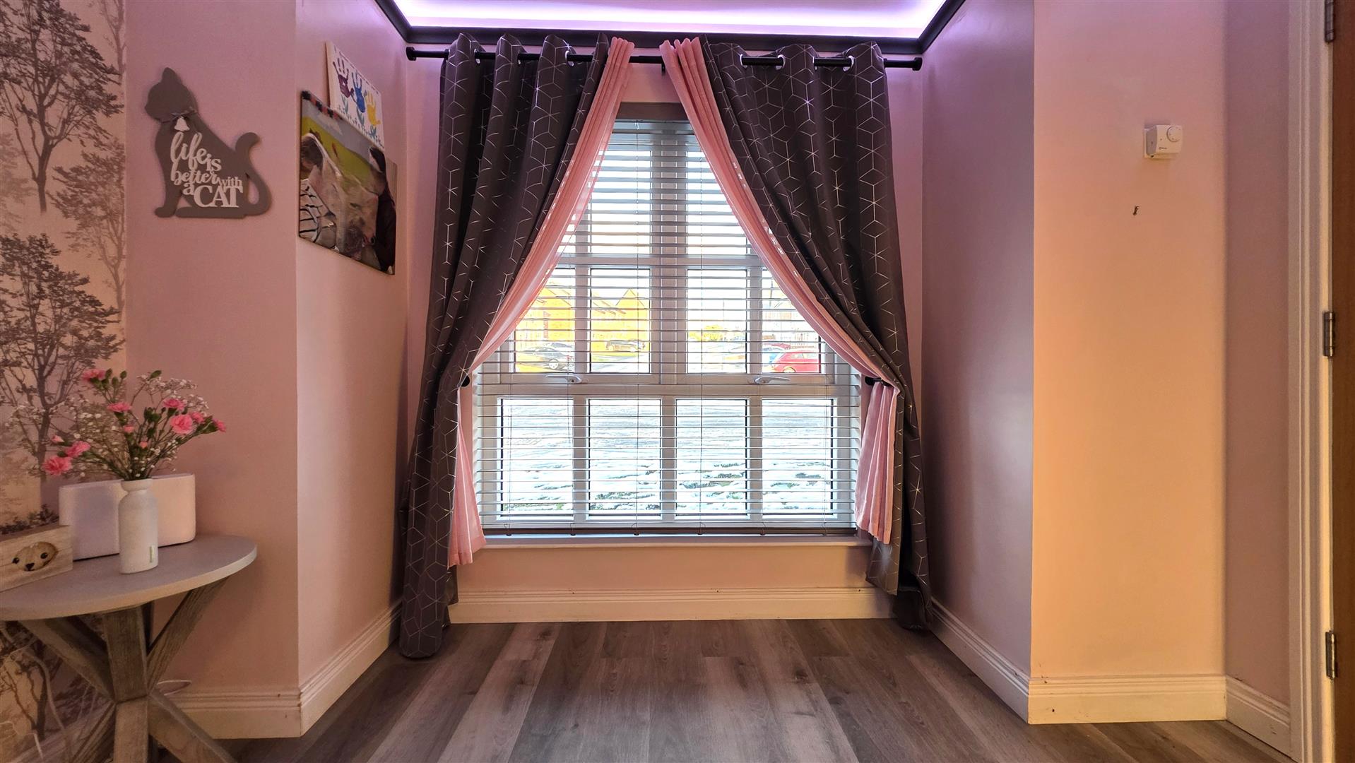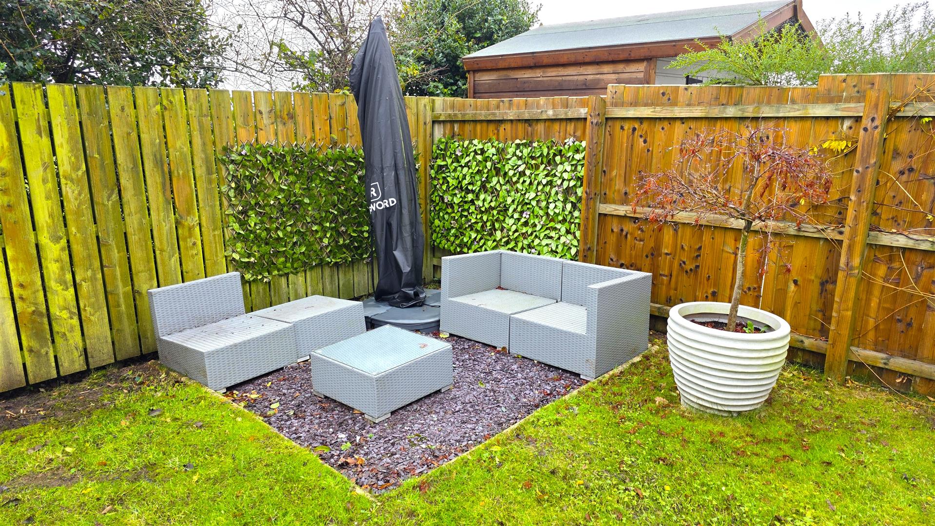 Fully enclosed rear garden with superb privacy and sun orientation. 6Ft timber fencing and pedestrian gate to the front. Elevated views towards towards Lough Neagh and Antrim town. Neat lawn with flower bed borders and raised paved patio. Outside tap and lighting.
