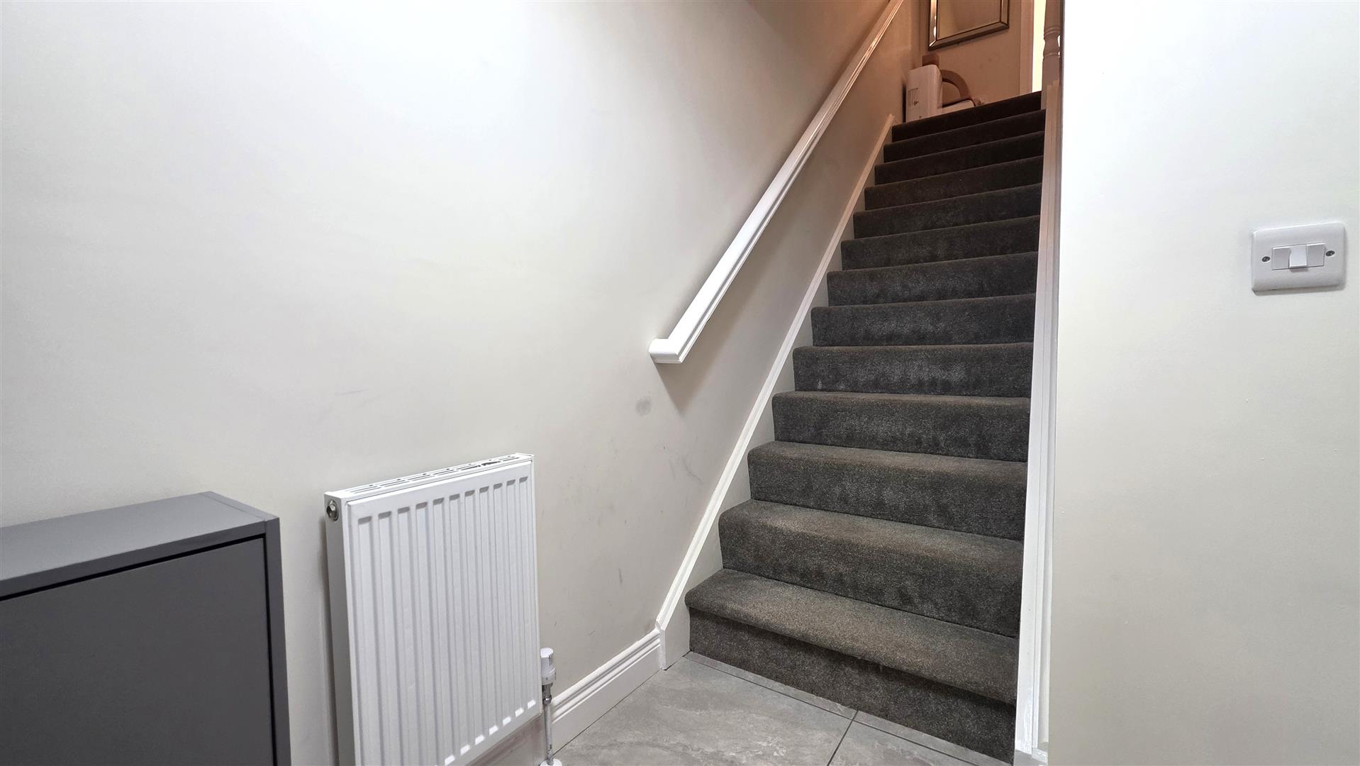 Fully tiled floor. Staircase to first floor with moulded handrail. Single radiator.