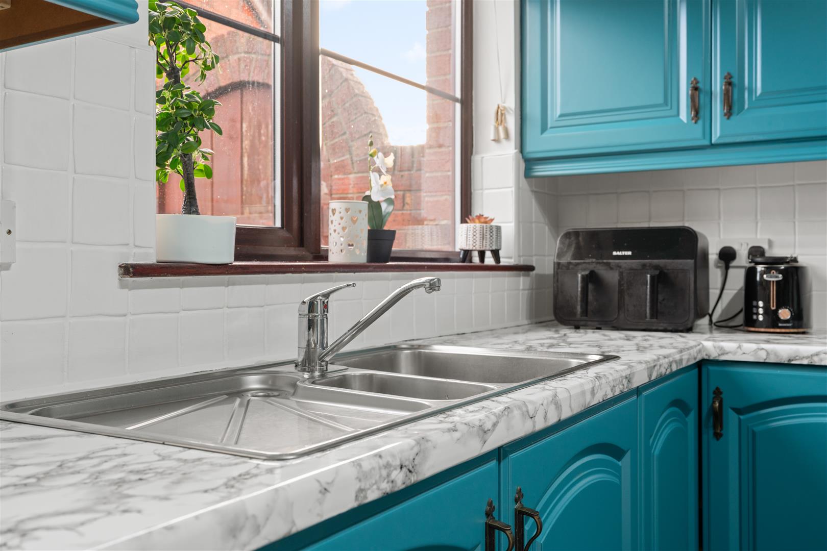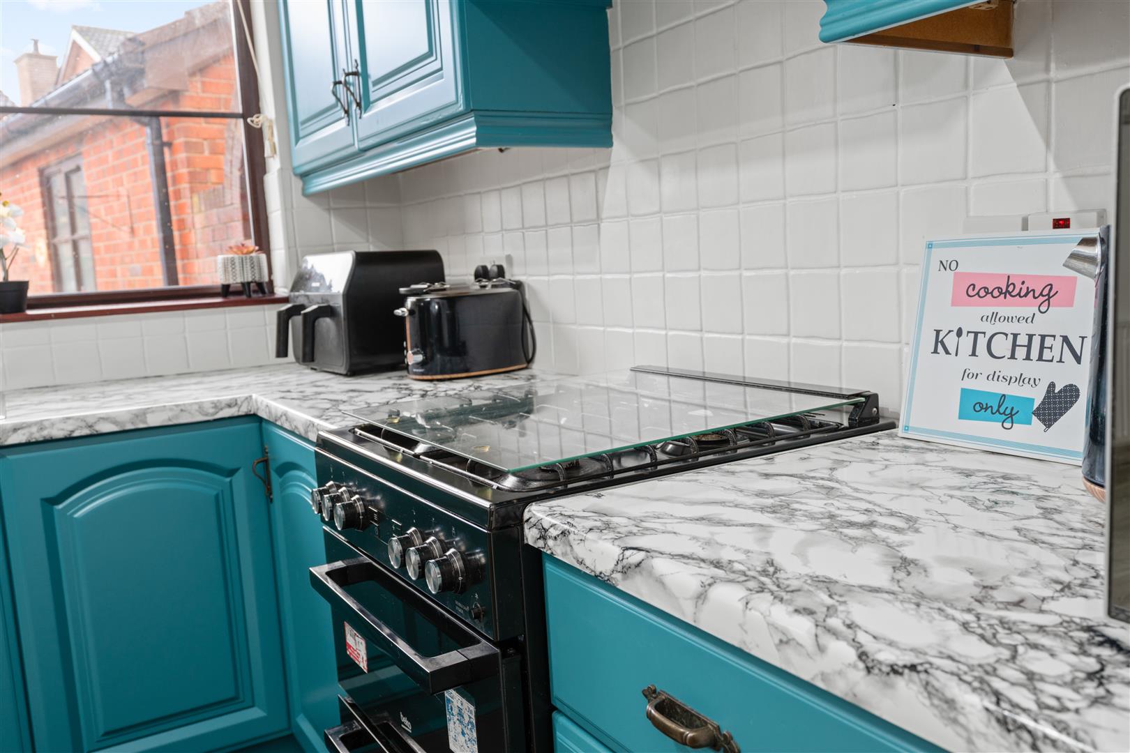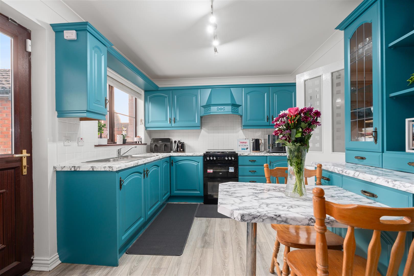 Full range of painted antique pine effect high and low level units with feature handles and contrasting work surfaces. One and a quarter bowl single drainer stainless steel sink unit and mixer taps. Space for cooker. "Welsh" style dresser with leaded glass display cupboards and open shelving. Wood laminate floor. Mahogany effect PVC double glazed door to rear. Two double radiators. Open square archway to: