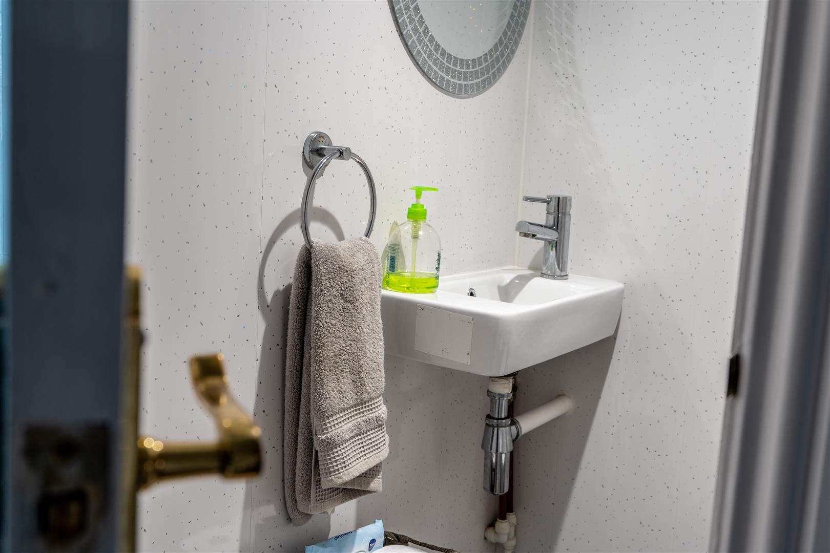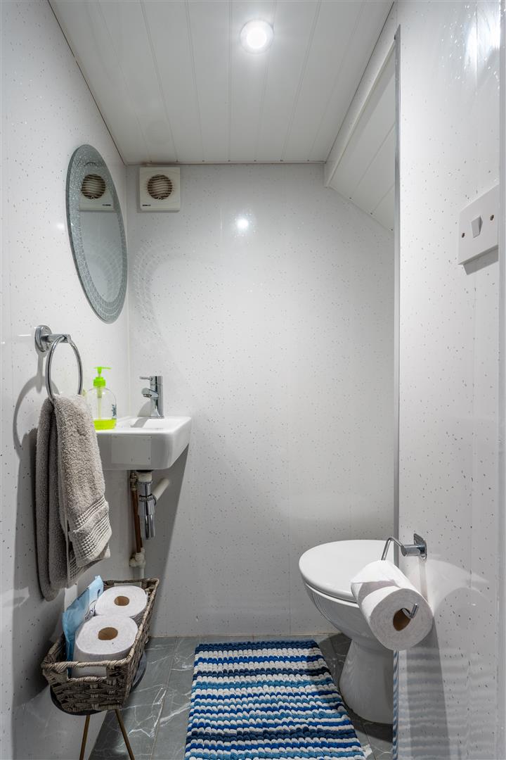 Modern white suite comprising push button low flush W/C and wall mounted trough style wash hand basin with feature mixer taps. PVC paneled walls and ceiling. Extractor fan. Fully tiled floor.