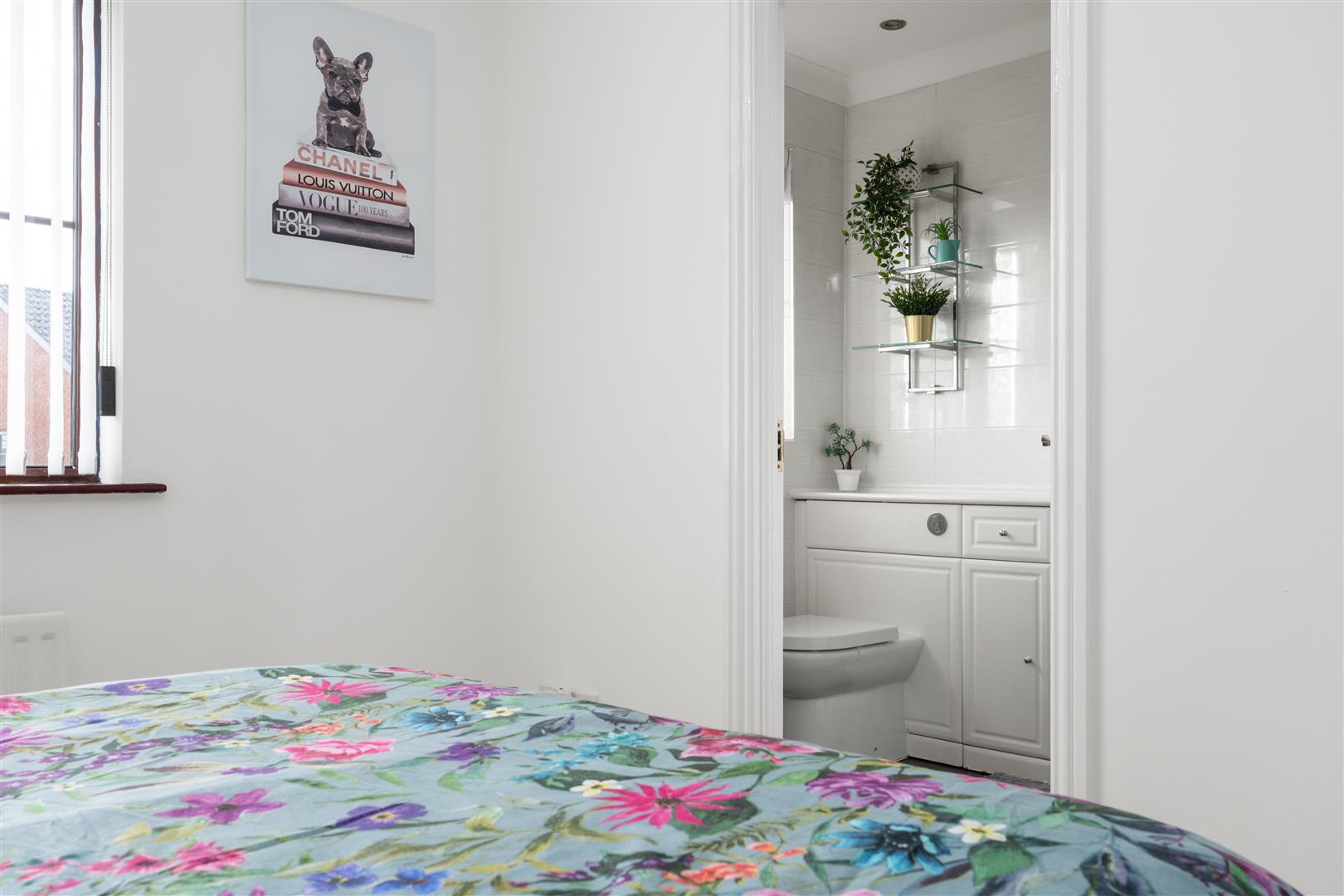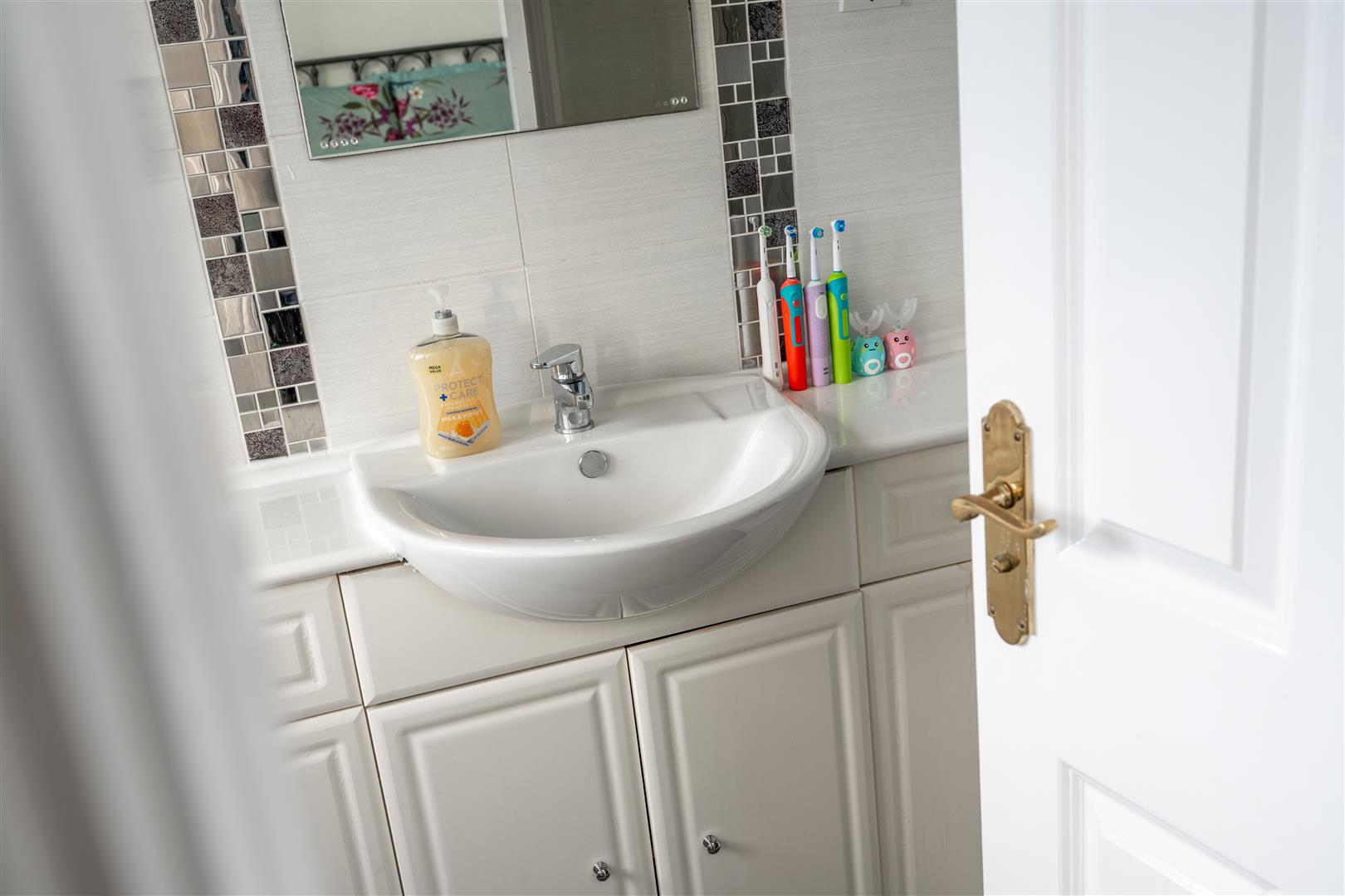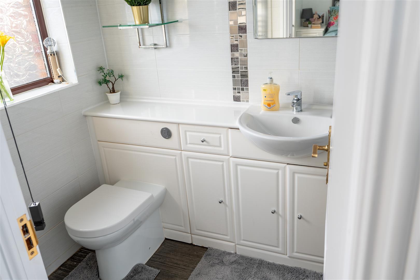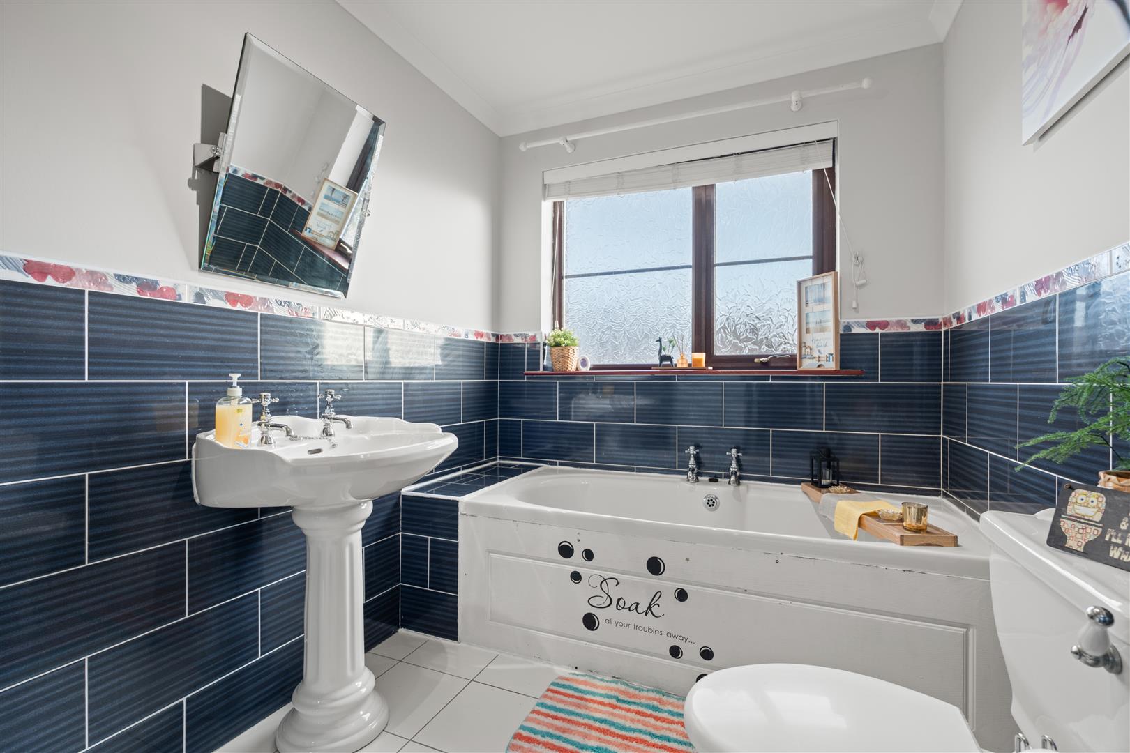 Modern white suite comprising double ended bath with off set taps. Low flush W/C and pedestal wash hand basin. Fully tiled corner quadrant shower cubicle with thermostatic unit and sliding cubicle doors. Half tiled walls with decorative border. Fully tiled floor. Double radiator.