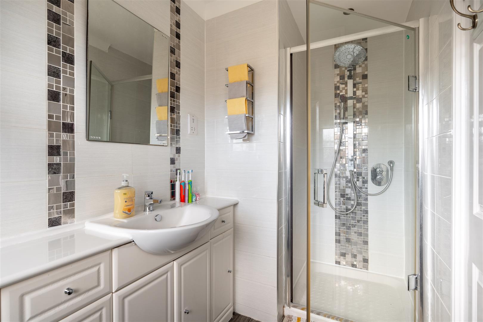 Modern white suite comprising concealed cistern to push button low flush W/C with modern wash hand basin and mixer taps inset to vanity unit with storage below. Fully tiled shower cubicle with large shower head and additional hand held shower. Pivot glazed door. Fully tiled walls with decorative insets. Feature fully tiled floor. Low voltage down lights. Extractor fan. Heated towel rail.