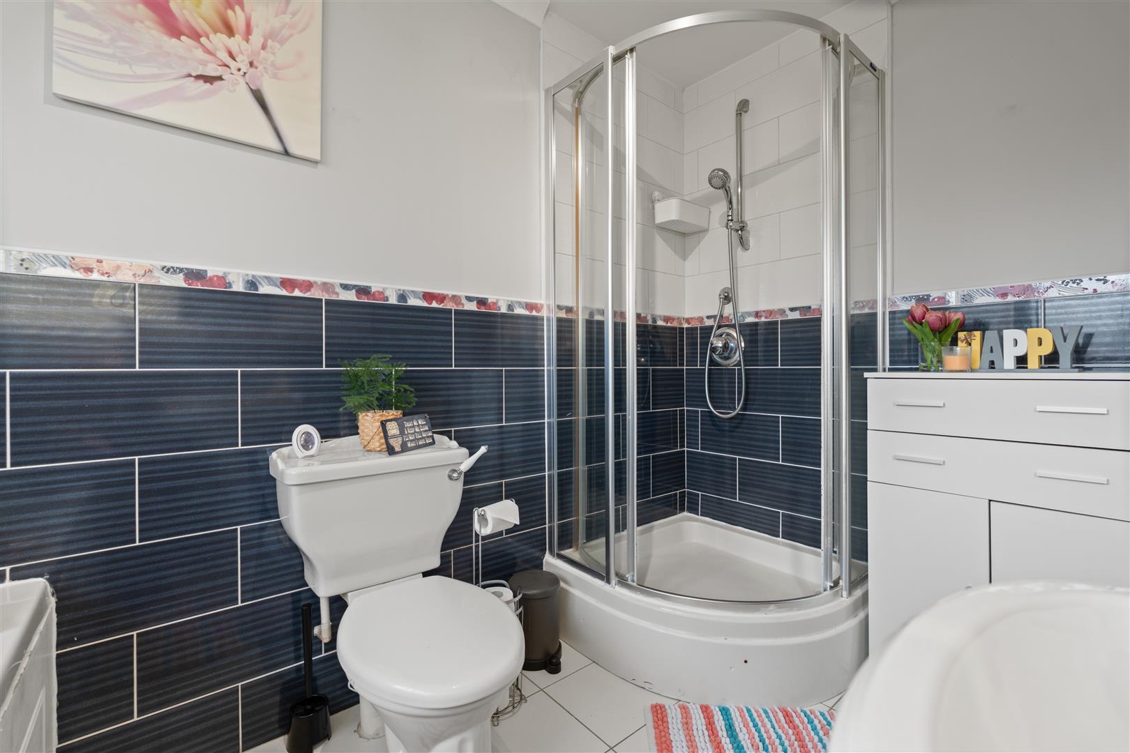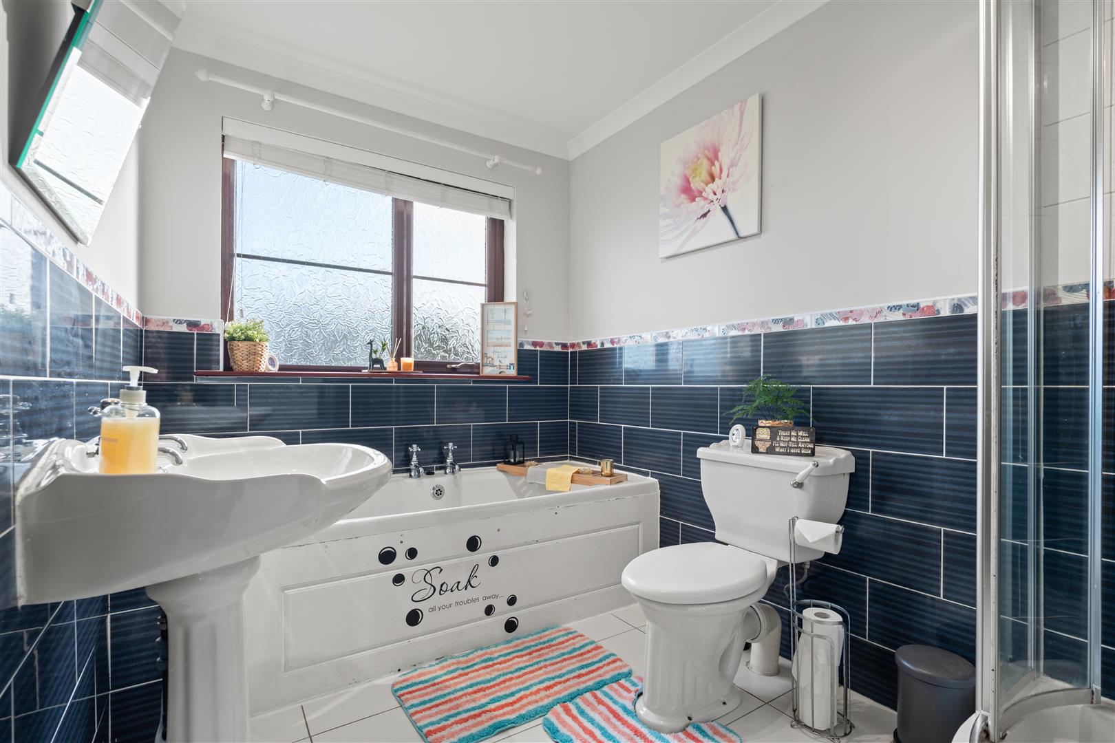 Bathroom with modern white suite to include double ended bath and separate fully tiled shower cubicle