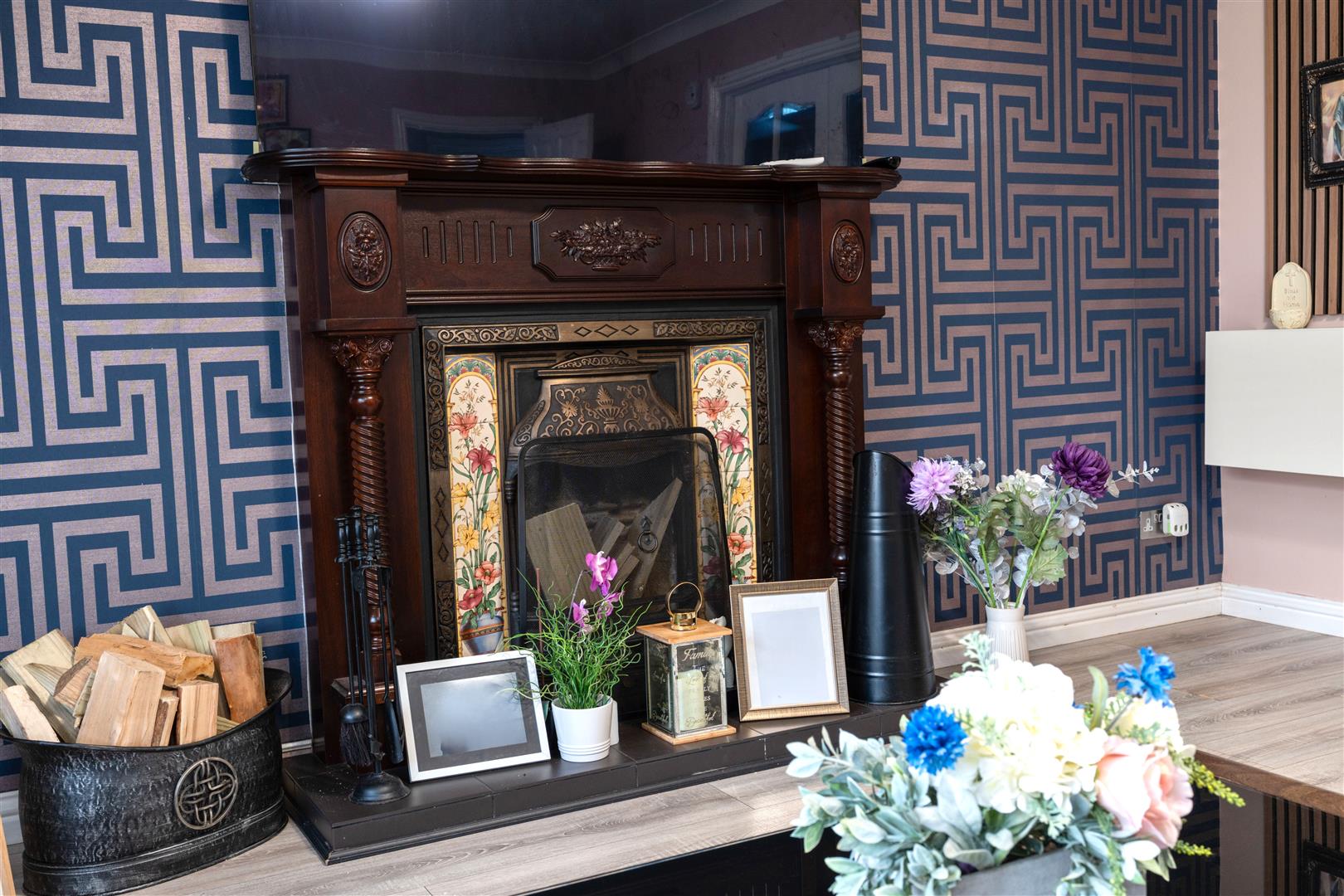 into bay window. Open fire with feature ornate mahogany fire surround and part polished cast iron inset. Tiled hearth. Wood laminate floor. Double radiator. 8 pane bevelled glass French doors to:
