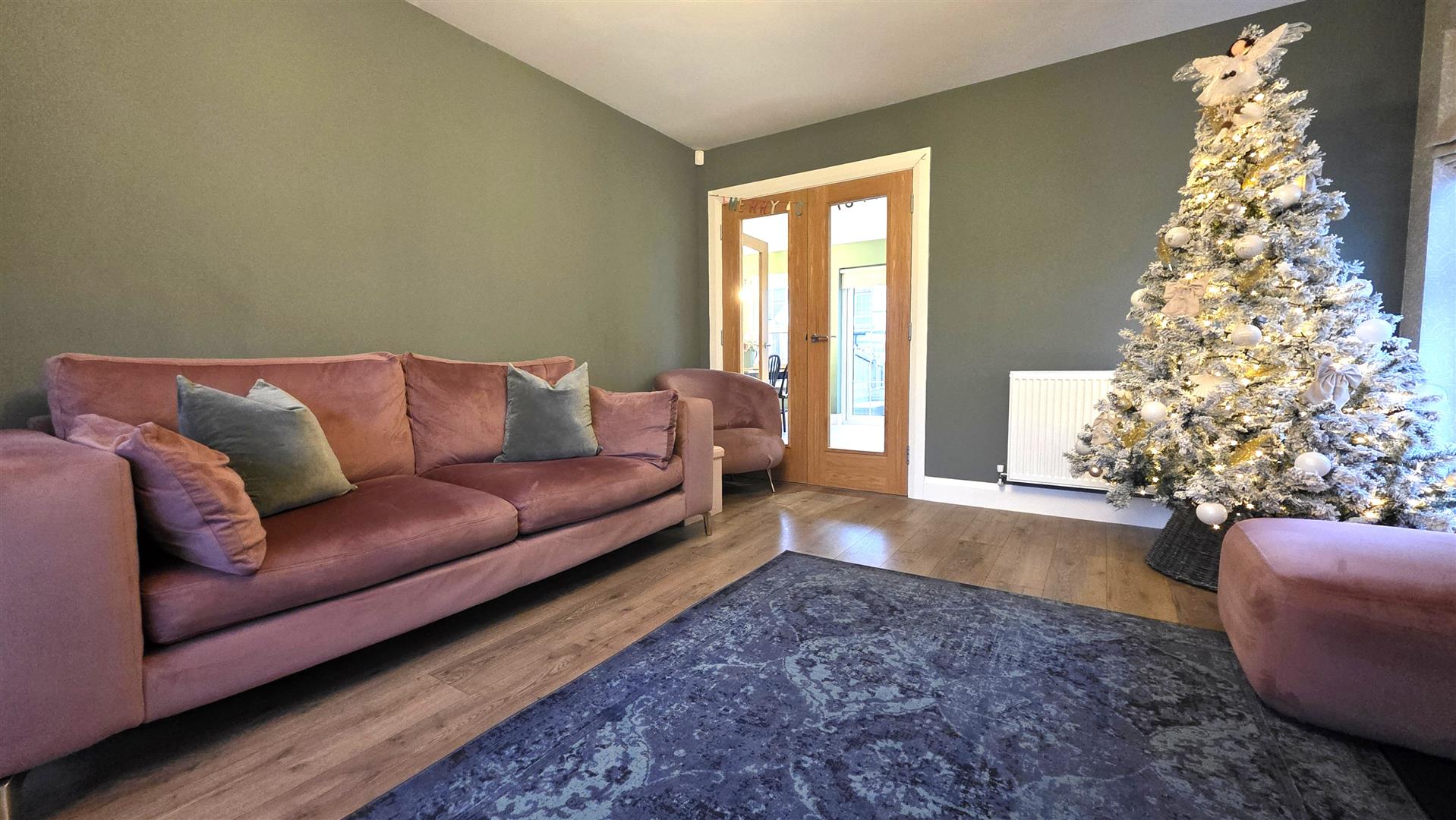 Feature electric contemporary style imitation log burning fire with polished granite hearth and granite surround. Wood laminate flooring. Double radiator. Glass panel double doors to;