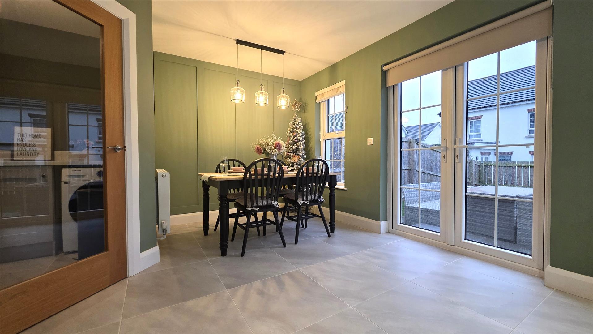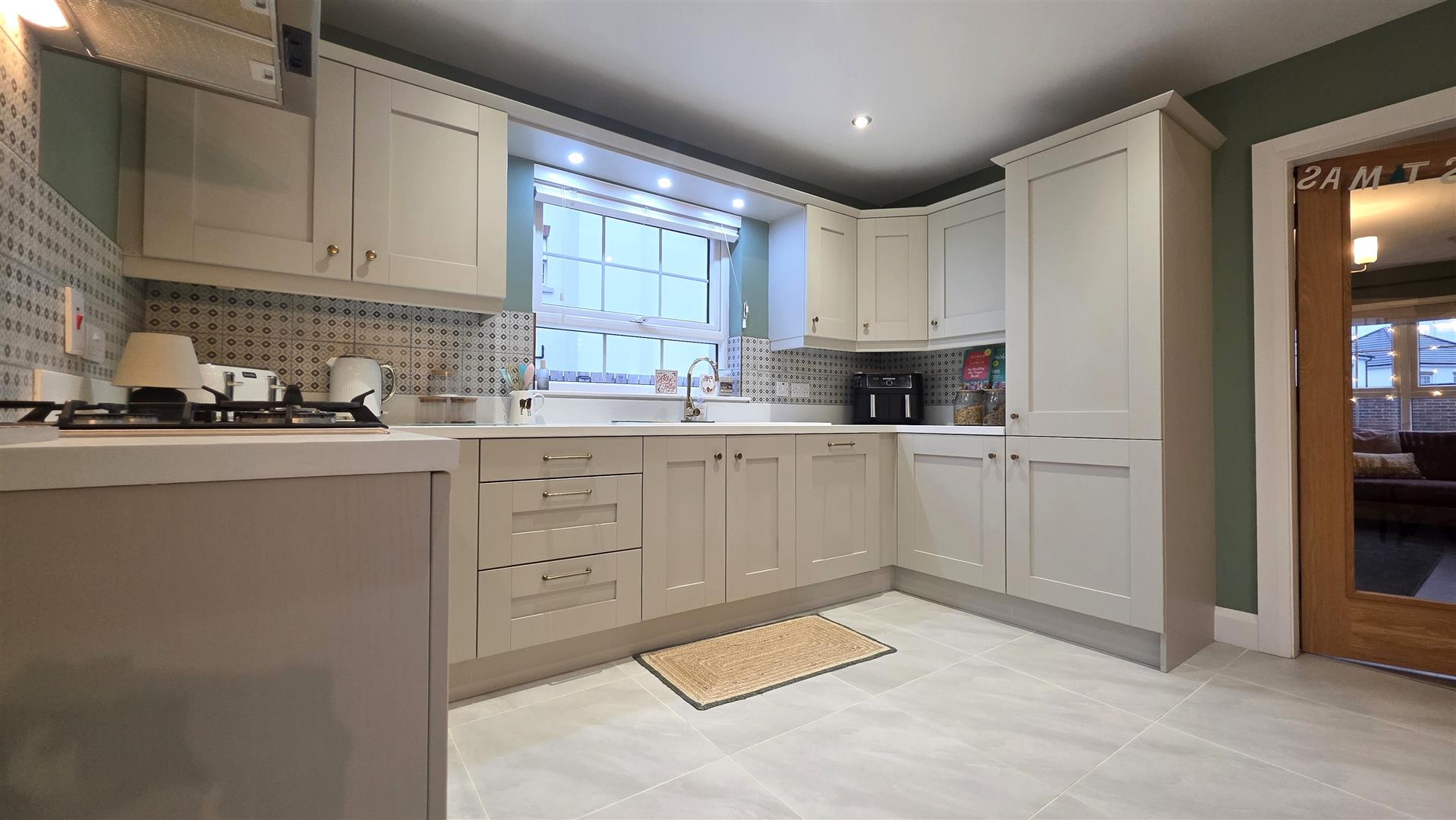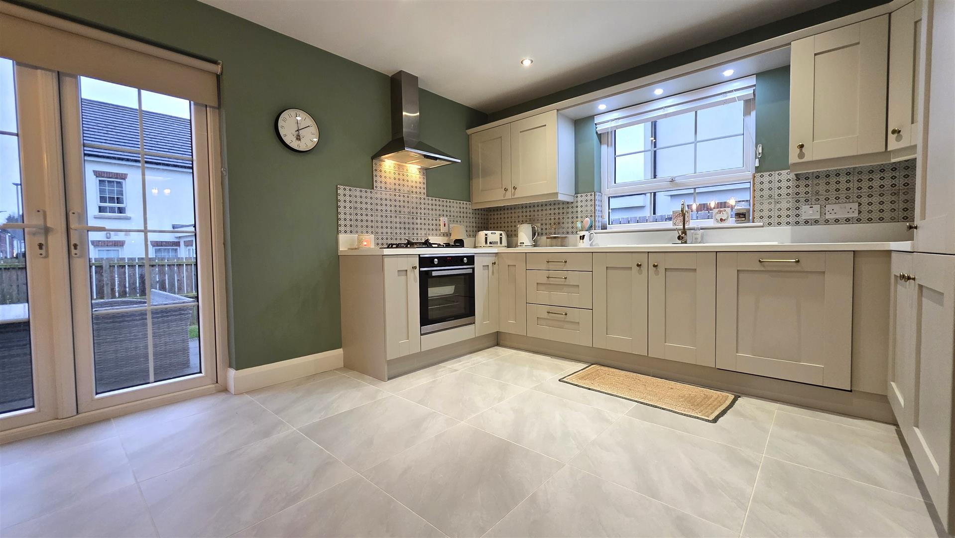 Full range of mid grey 'Shaker' style, high and low level kitchen units with brushed gold handles, complimentary work surfaces and splashback tiling. One and one quarter bowl composite sink unit with golden mixer tap and LED pelmet lighting over. Integrated appliances to include a four ring gas hob with stainless steel pyramid style overhead extractor fan and a low level combination of oven and grill. Integrated fridge freezer and dishwasher. Fully tiled floor. Low voltage down lighting to kitchen area. Feature wood panelled wall to dining area. Double radiator. uPVC double glazed 'French' patio doors to rear.