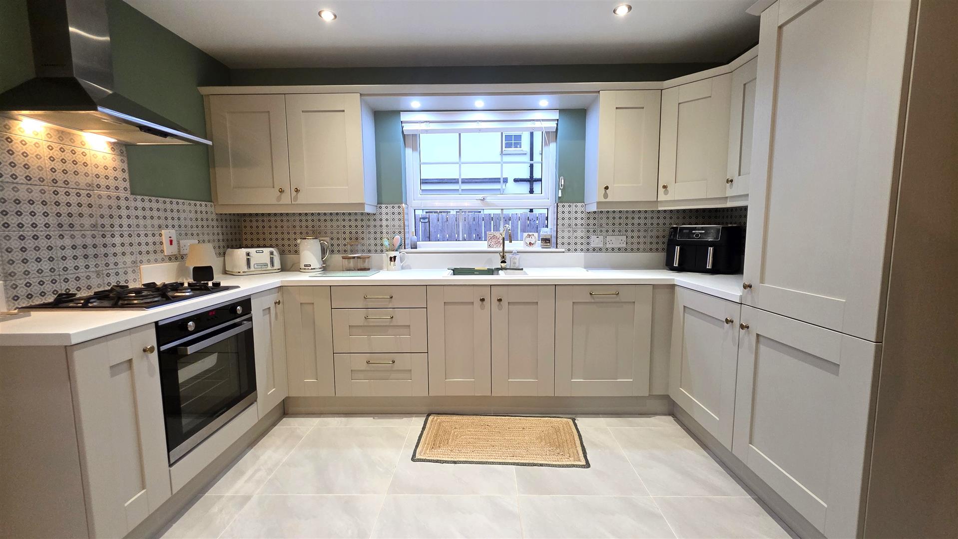 Matching range of high and low level kitchen units with brush stainless steel handles and complimentary work surfaces. Space for a washing machine and tumble dryer. Extractor fan. Fully tiled floor. Single radiator.